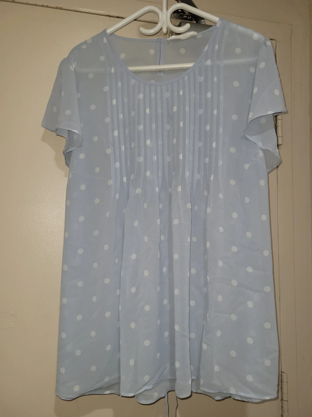 This light blue blouse features a classic polka dot pattern. It has short flutter sleeves and a tie-waist detail. The fabric is lightweight and flowy.