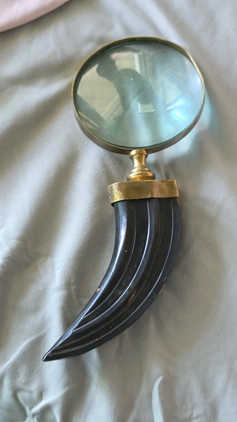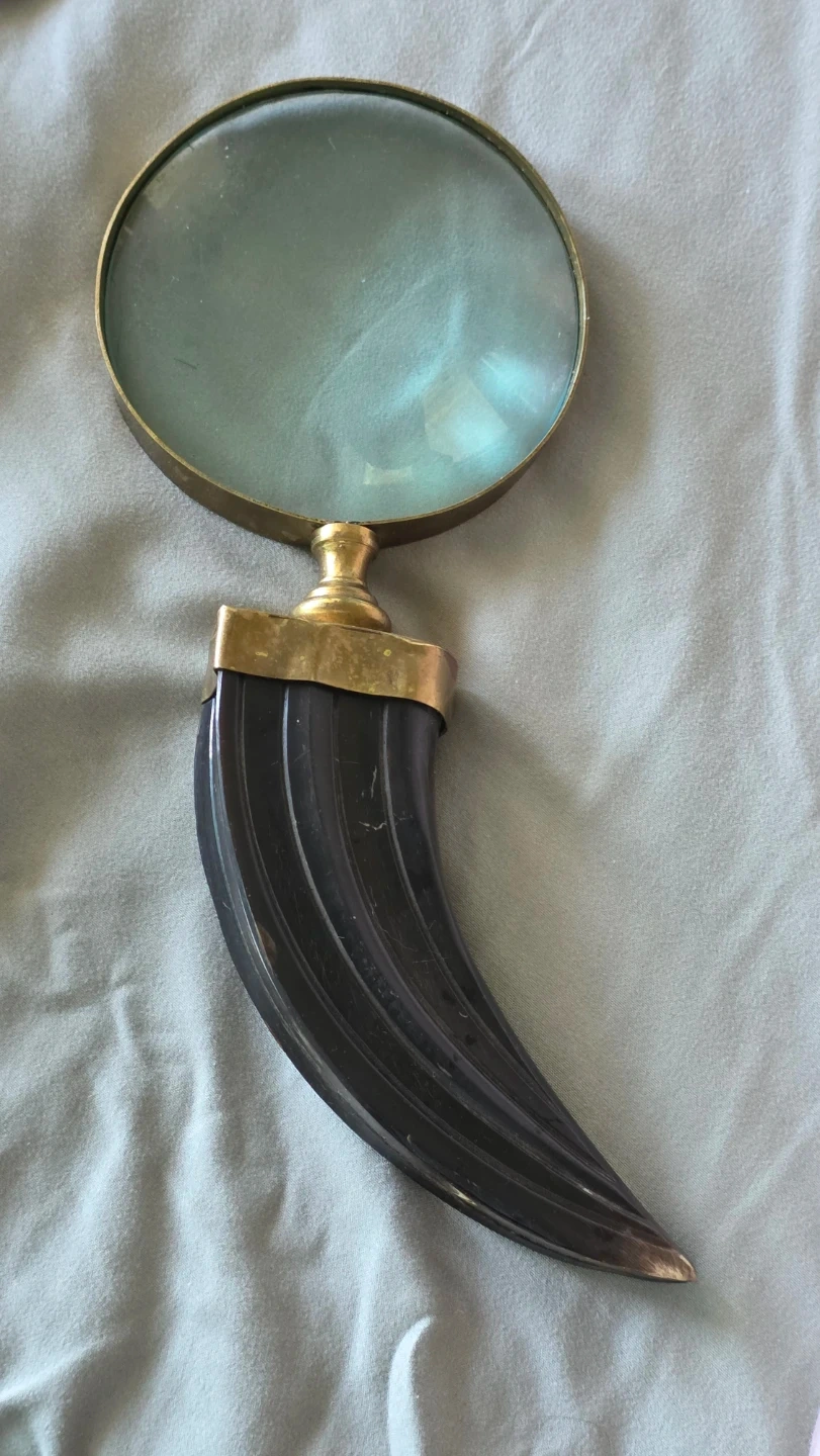 This magnifying glass features a clear lens with a brass-toned frame. It has a unique, decorative handle resembling a carved horn in a dark colour. The handle offers an interesting visual flair.