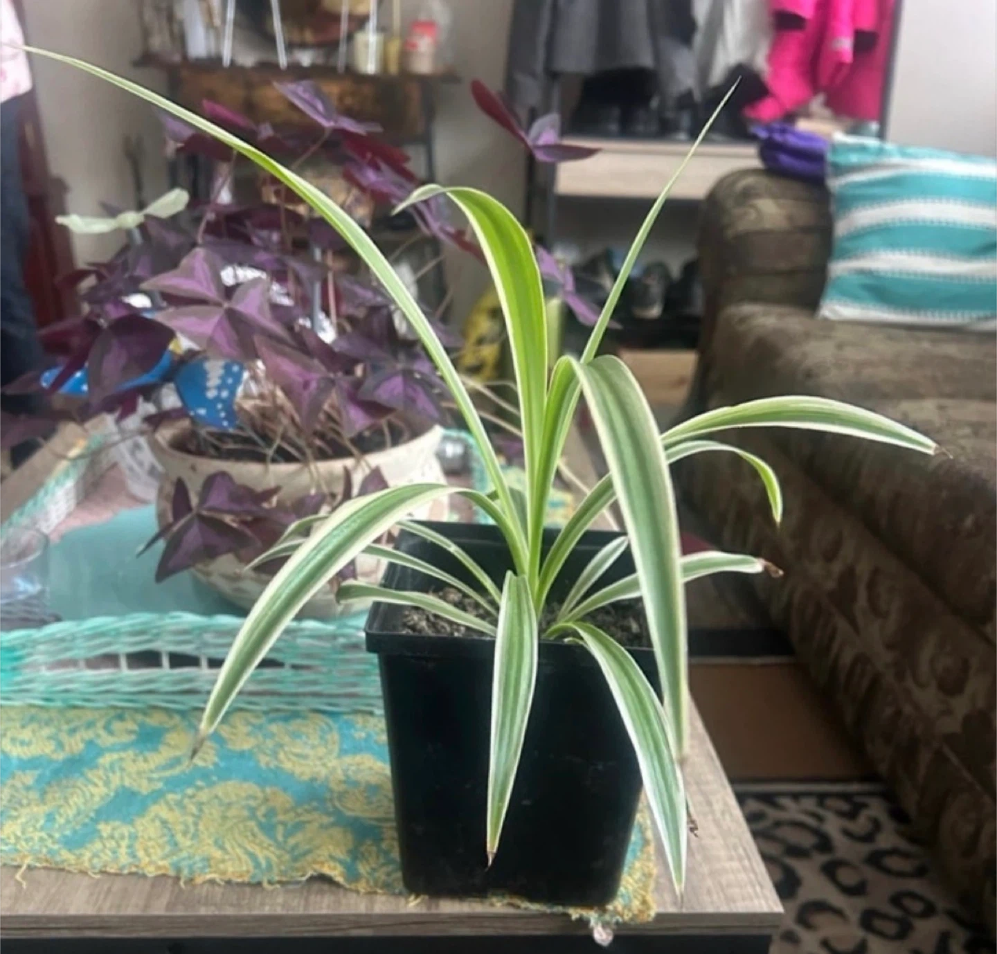 A healthy spider plant with variegated green and white leaves is potted in a black square planter. It's an easy-care plant that's great for indoor spaces.