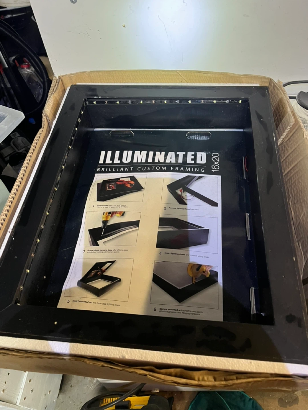 This is an illuminated framing kit for brilliant custom displays. It's a 16x20 size. Assembly instructions are included on the insert.