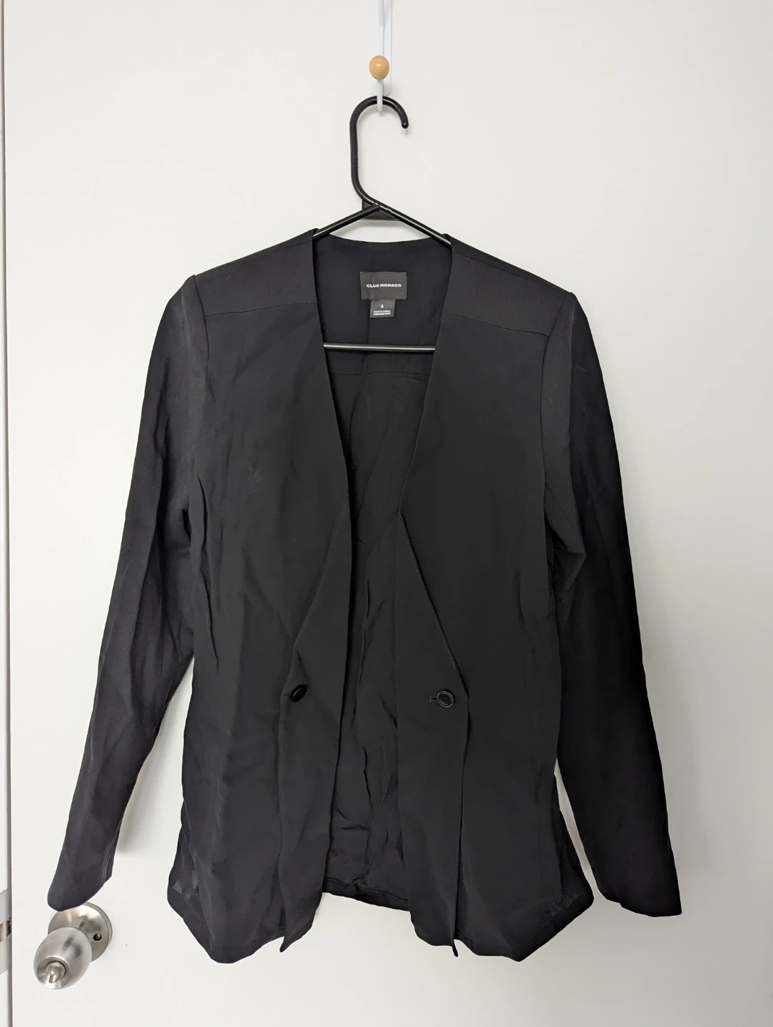 92Elevate your wardrobe with this chic Club Monaco black blazer, a stylish addition for any fashion-forward individual. This blazer features a sleek, tailored silhouette, perfect for both professional and casual settings. The fabric drapes beautifully, offering a comfortable and flattering fit. Being pre-loved, it showcases character without compromising on style, making it a sustainable and sophisticated choice. Specifications: * Brand: Club Monaco * Colour: Black * Size: 0 Just a friendly note, if you're seeing this ad, the blazer is still waiting to find its new home! Pick up the item near the intersection of Kipling and Eglinton.