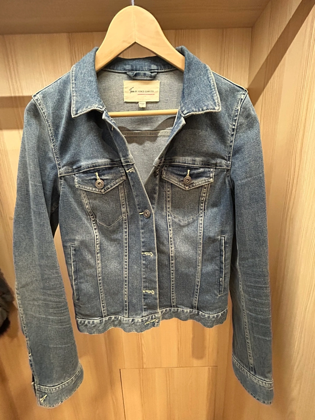 Here's a stylish denim jacket from Vince Camuto! It's a size S and in great condition. Perfect for layering or wearing on its own. It's a classic piece that would look great with any outfit