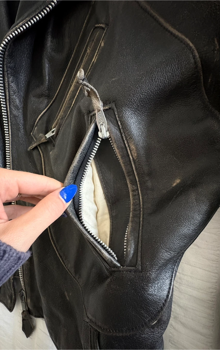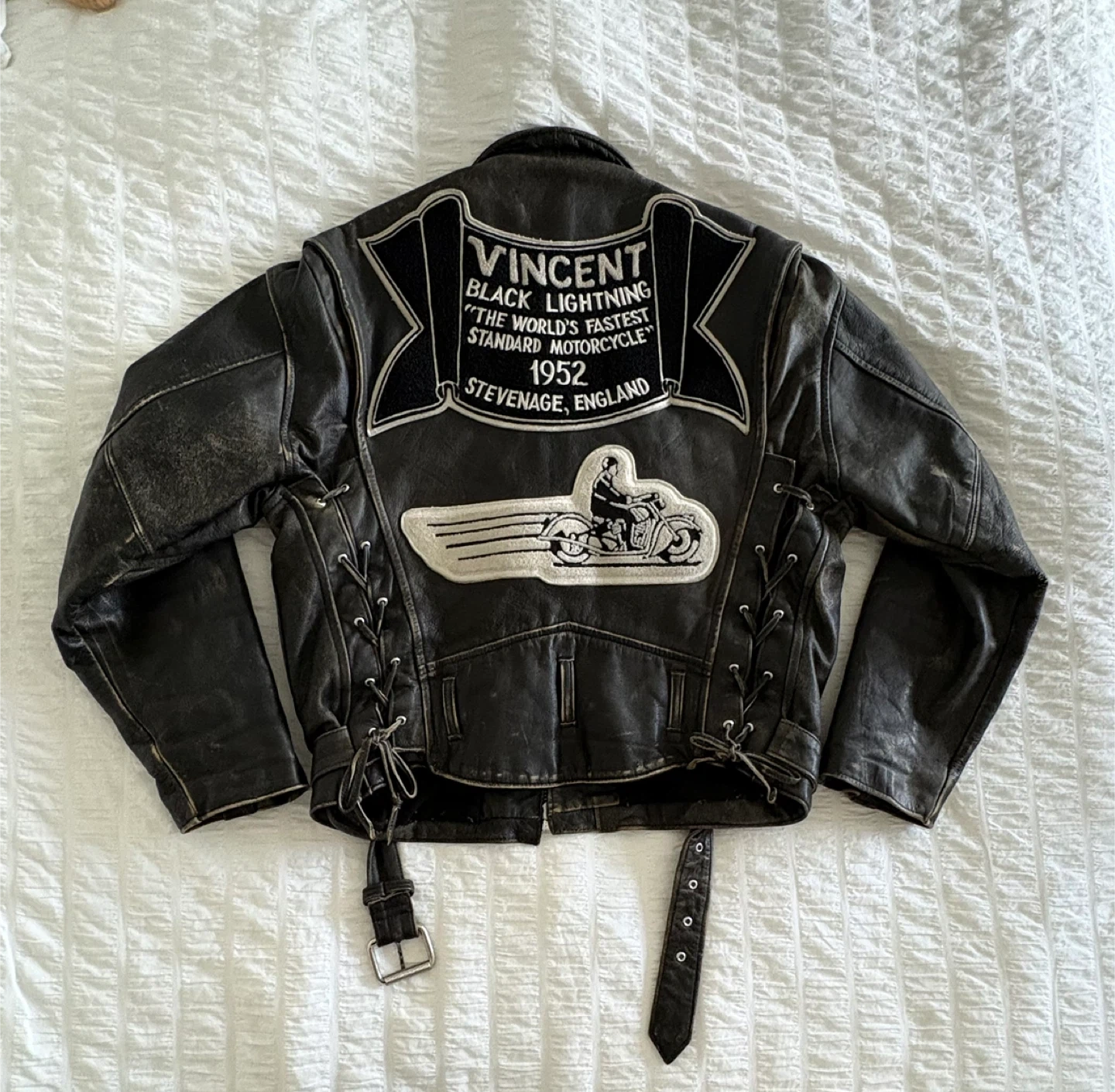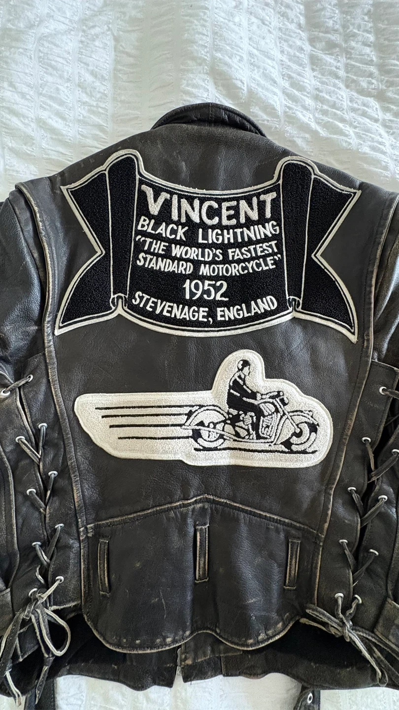 Vincent black lightning vintage leather motorcycle jacket, 1990s custom patchwork excellent condition