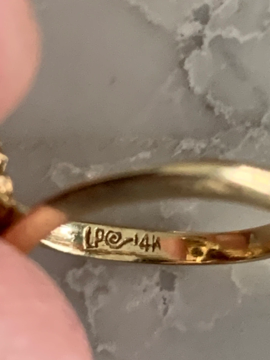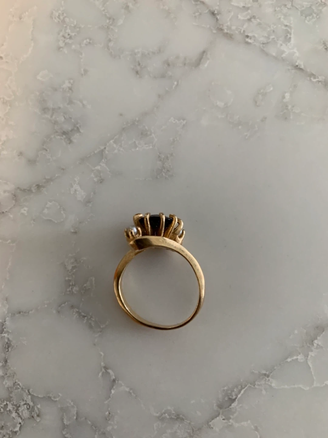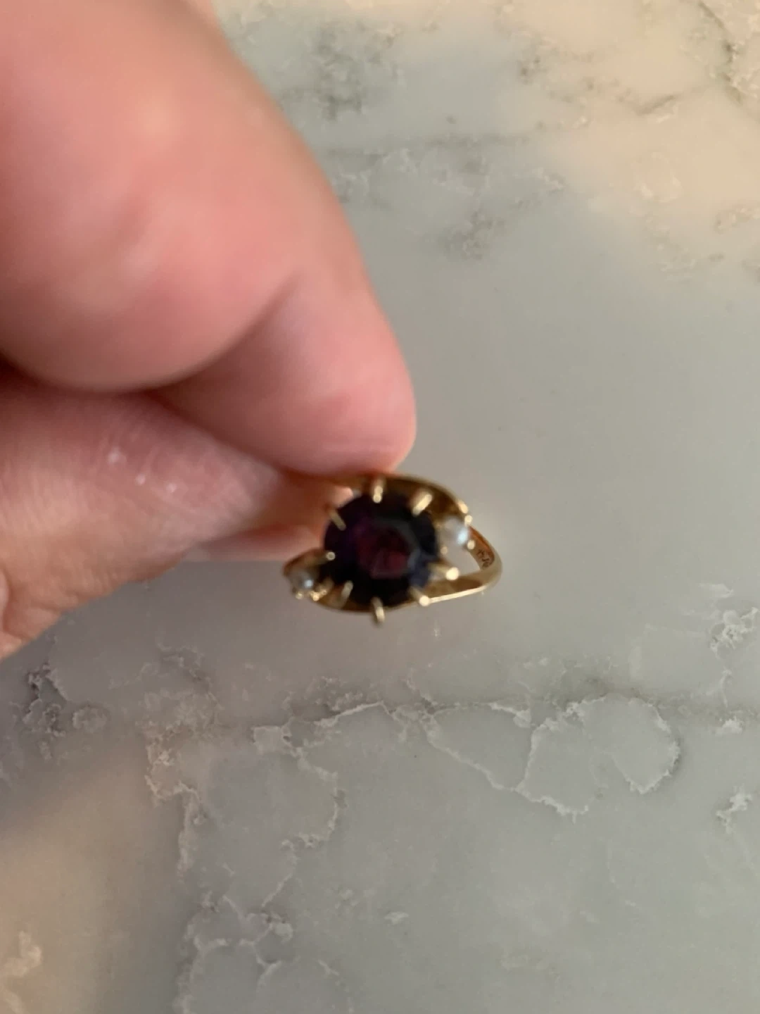 67Selling a vintage 14K gold ring. It features a dark purple stone surrounded by small white stones. A beautiful piece to add to your collection!