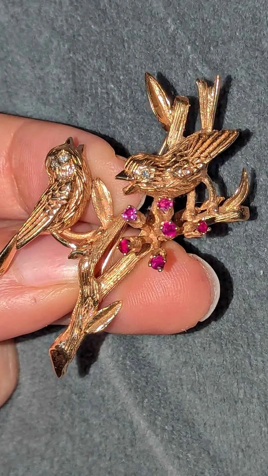 170Beautiful and collectable vintage 14K solid gold brooch, stamped TOR, with rubies & diamonds. Approx 10 grams. More info and photos can be provided for serious inquiries.