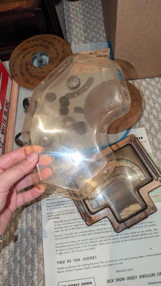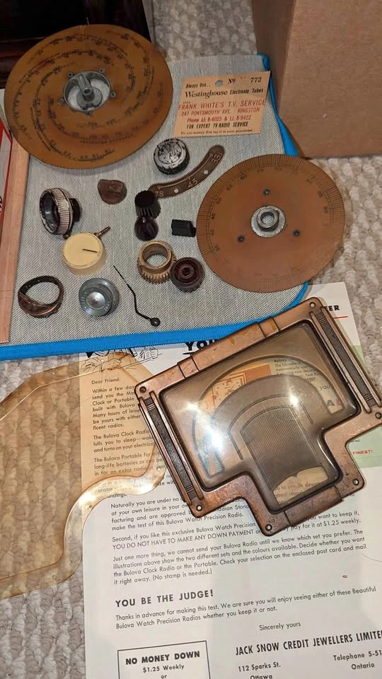 170Vintage mixed lot of mid-century radio components and paperwork — a great find for collectors, restorers, or vintage décor enthusiasts. Includes: Art Deco copper-tone metal bezel and convex lens (from a Bulova or Rogers tabletop radio, c. 1950) Two bakelite tuning dials marked in kilocycles/meters (Westinghouse style) Assorted radio knobs, tuning gears, spacers, and pointer needle Clear molded lens cover Original 1950s Bulova “You Be The Judge” advertising flyer from Jack Snow Credit Jewellers, Ottawa Vintage Westinghouse Electronic Tubes service card from Frank White’s T.V. Service, Kingston All items are untested and sold as-is, with light age wear and patina. Perfect for radio restoration projects, steampunk art, or nostalgic display. 📦 Entire lot sold together. Pickup Burlington 📍