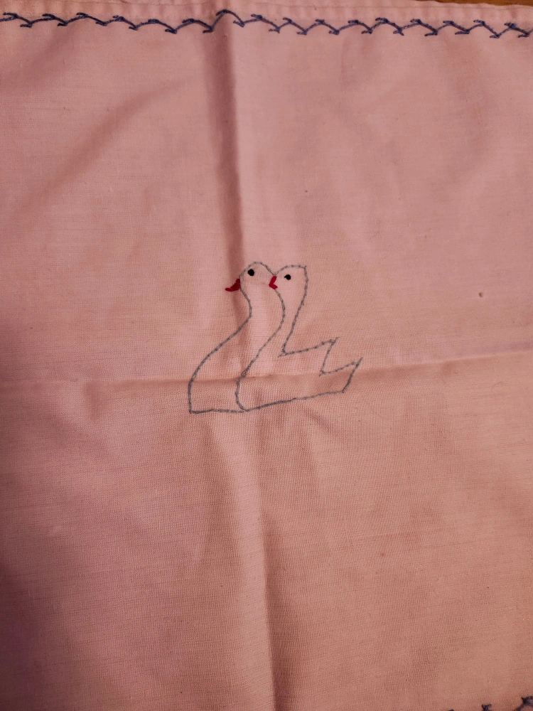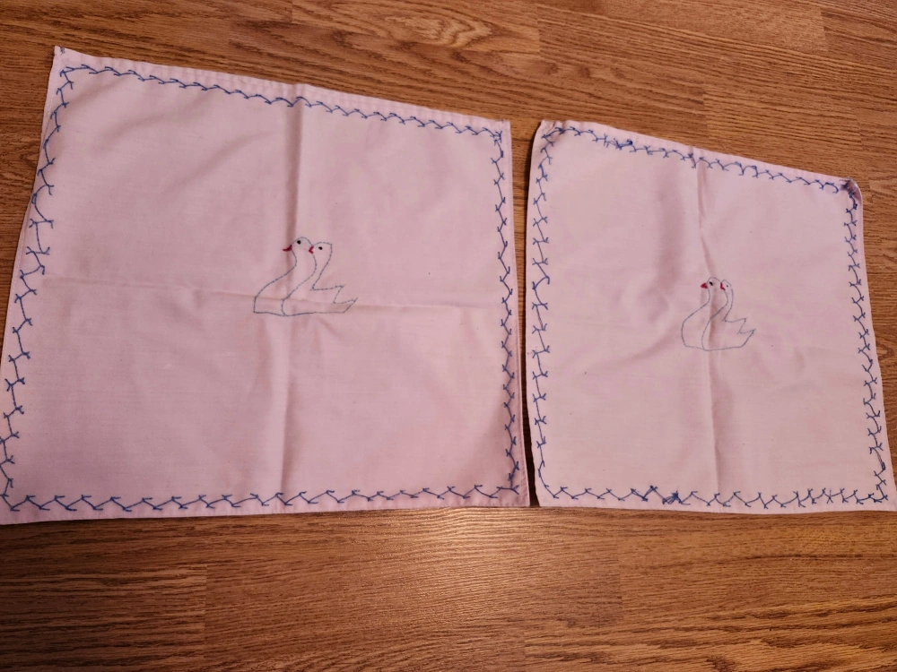 1980's pair of delicate pink cotton cusion cases. Features hand embroidery of swans. Blue stitching accents the edges. Square shape. 13"x14" never used no zippers, no buttons, it is open end smoke free pet free