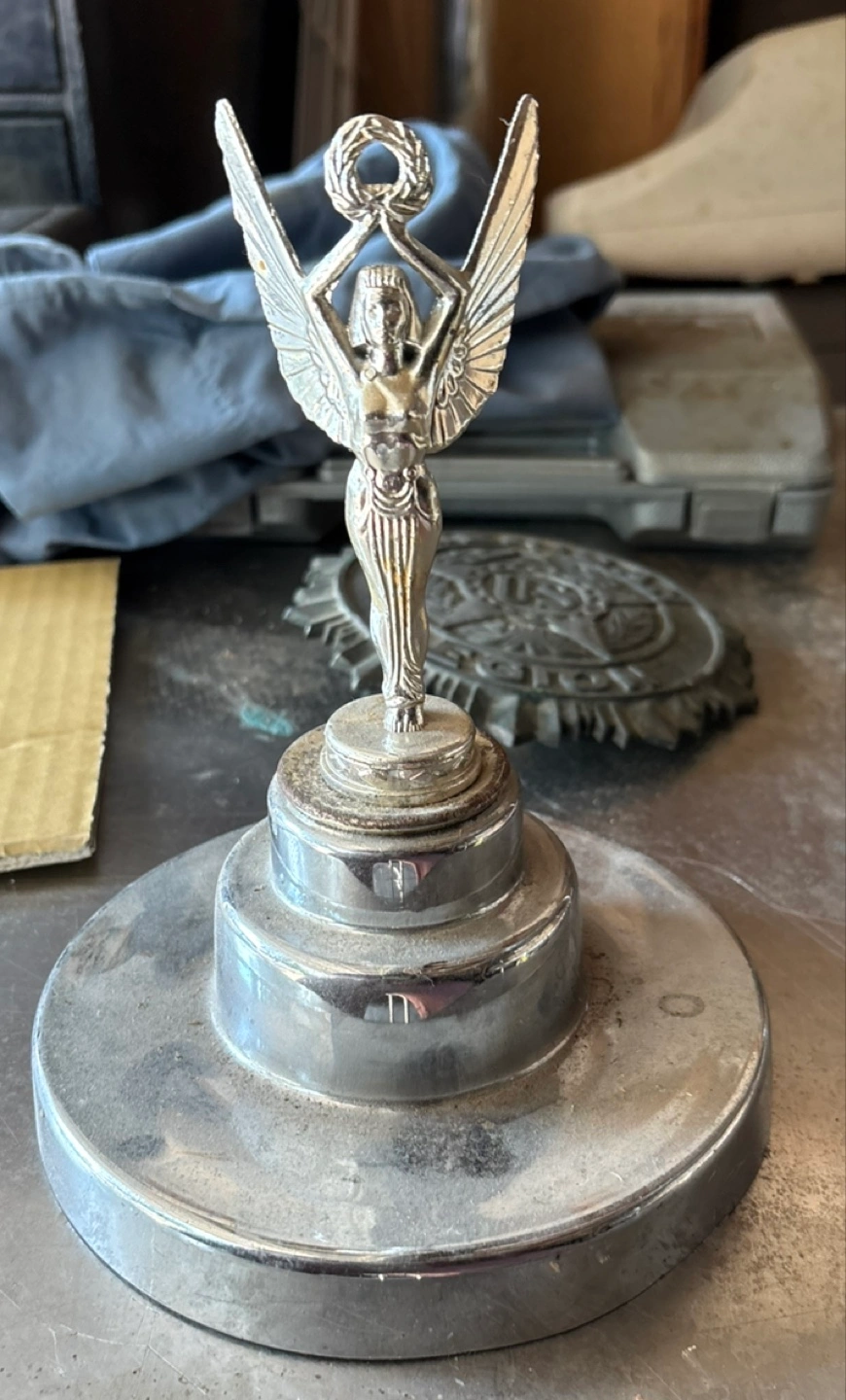 Selling a vintage angel car mascot, also known as a hood ornament. It has a beautiful, classic design. It shows some signs of wear, which adds to its vintage charm