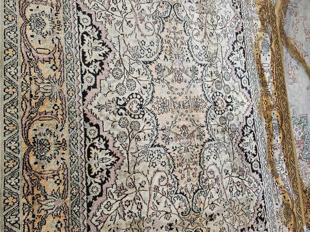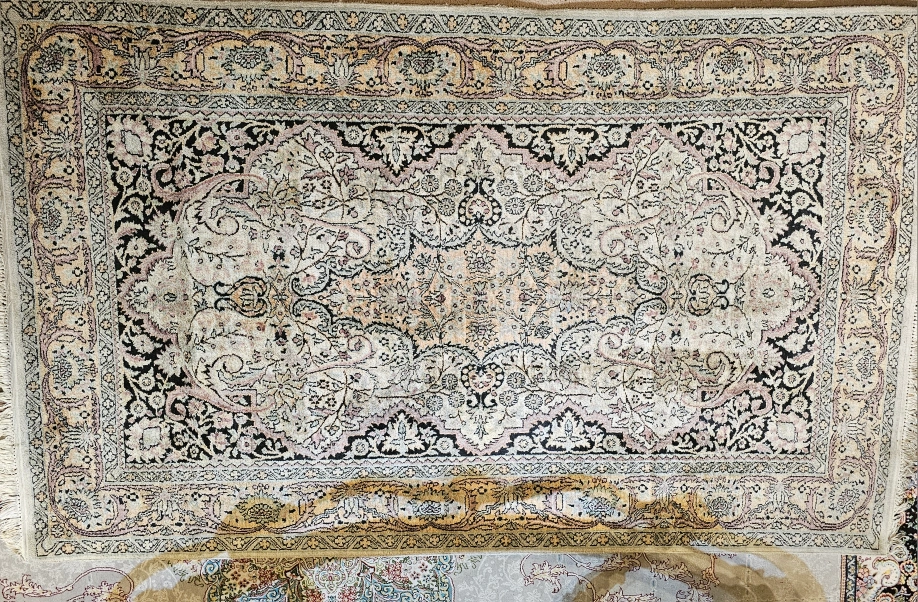 10Here's a antique completely ilk hand knoted rug with a lovely floral pattern! It features a detailed border and a soft, neutral colour palette. Perfect for adding a touch of elegance to any room