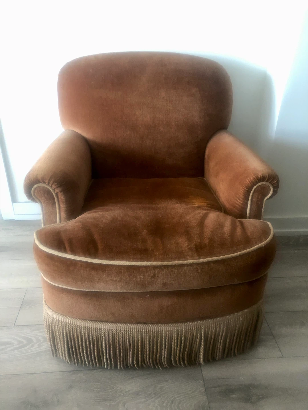 Two charming vintage armchairs with a lovely brown velvet finish. It's in good condition and would make a great addition to any room. The chair features a unique fringe detail at the bottom, adding to its vintage appeal