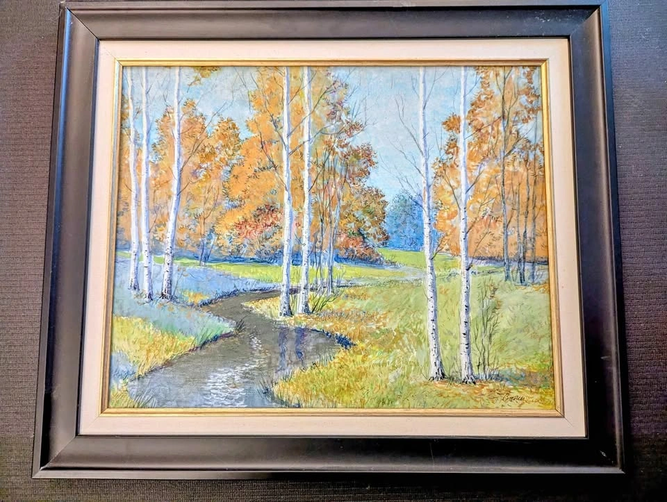 135Beautiful original oil painting of an autumn birch forest with a winding stream. The warm orange and gold tones with soft blues create a peaceful, cottage-style atmosphere perfect for any living room, office, or cabin. Artist signature: Basum Medium: Oil on canvas Size: Approx. 20β x 24β (25β x 29β framed) Professionally framed and ready to hang Excellent vintage condition Ideal for lovers of Canadian landscapes and nature scenes.