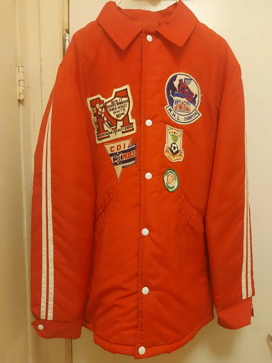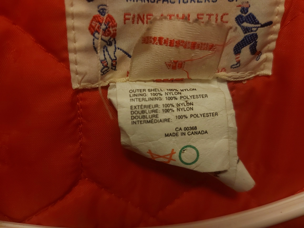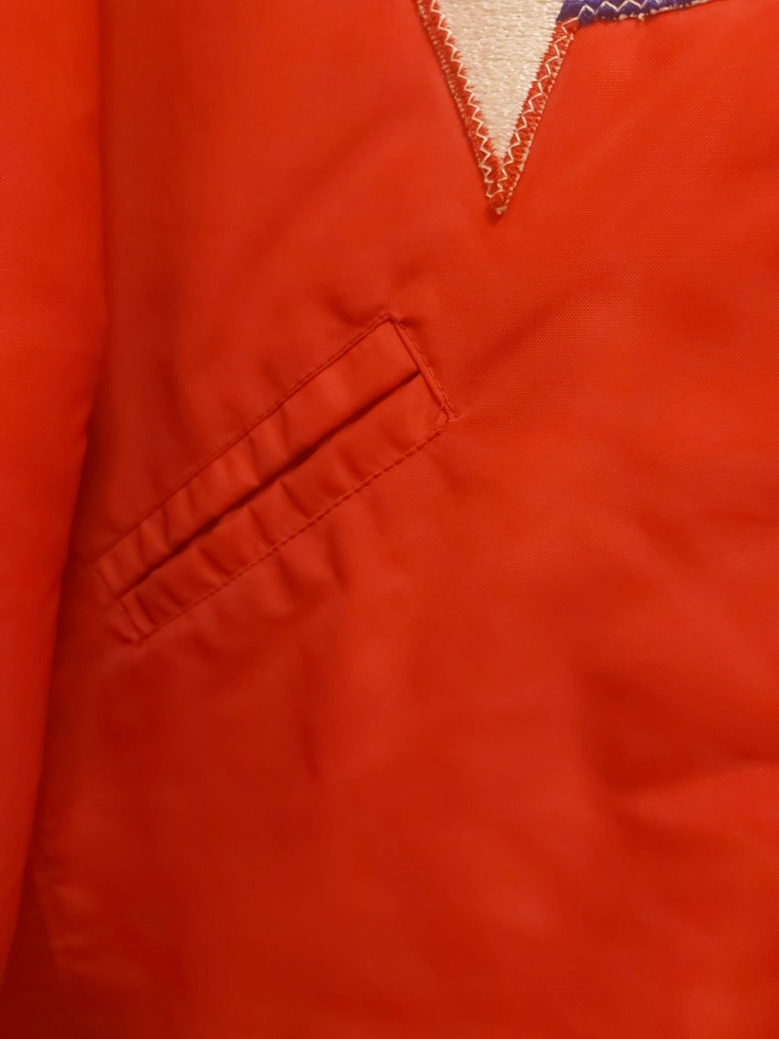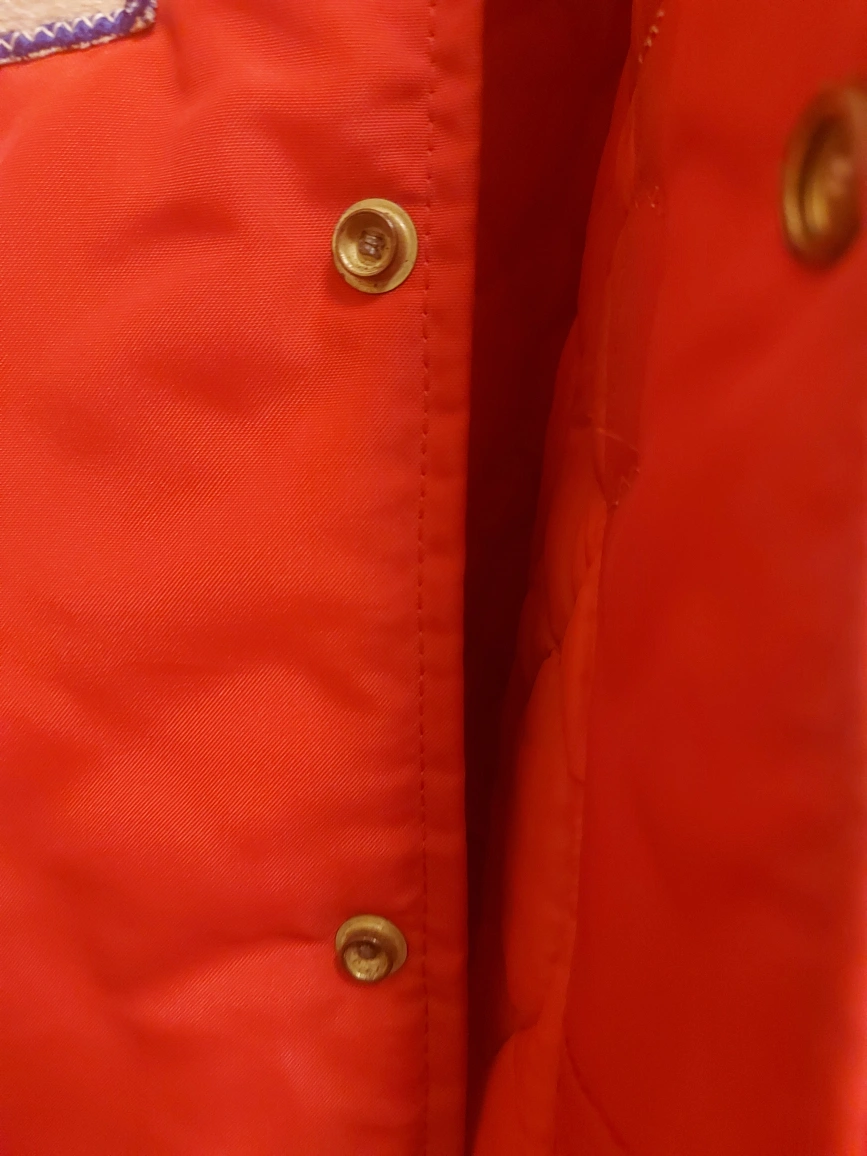 5This vibrant nylon jacket is perfect for the fall season! The item was originally thrifted and it is a size 40. It is in good condition, though when it was acquired it had some loose threads, wear on the buttons and some minor discolouration towards the collar. The jacket features several different patches and crests from youth sports teams in the GTA and in North America. As well it has a rich red colour with contrast white stripes along the sleeves.This would be a great addition to any closet! Furthermore I am glad to answer any questions and take more photos, if requested. Lastly please feel free to check out my printer studio online store with a selection of items I designed. Printer Studio Online Store Link: https://www.printerstudio.ca/sell/agyei_atelier