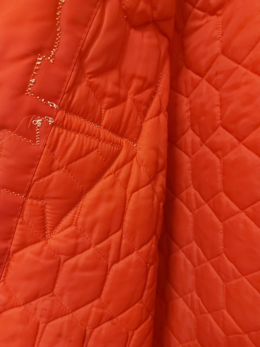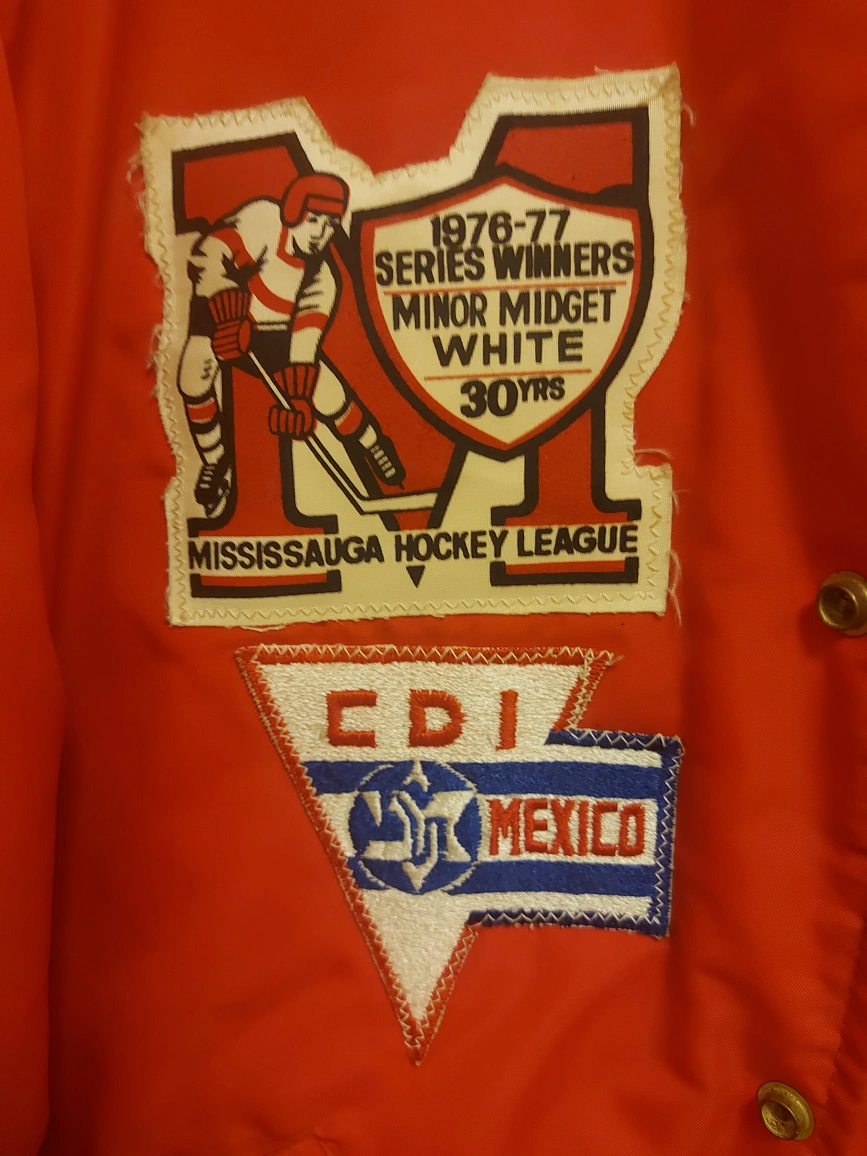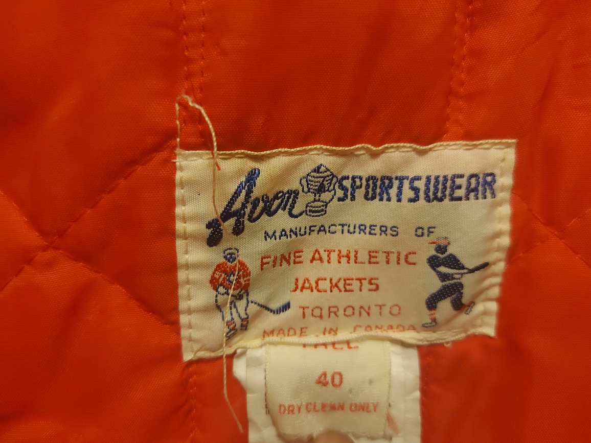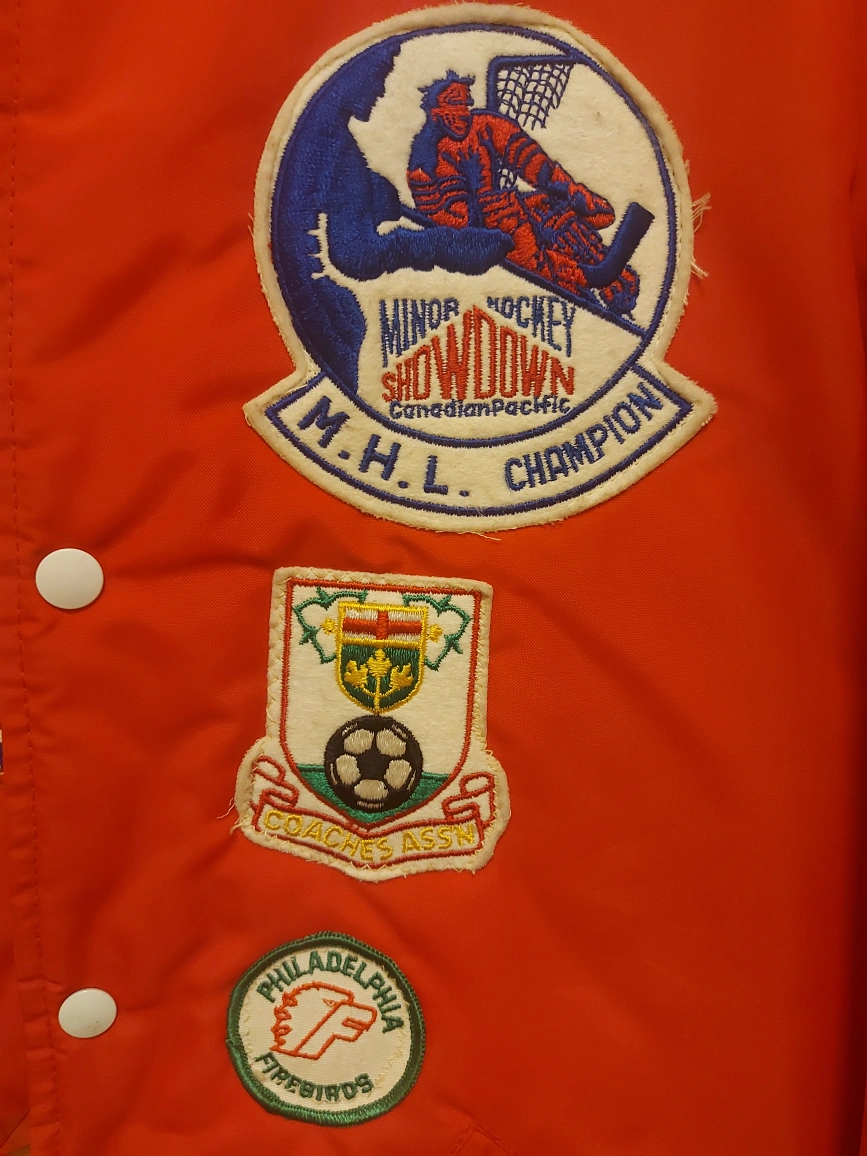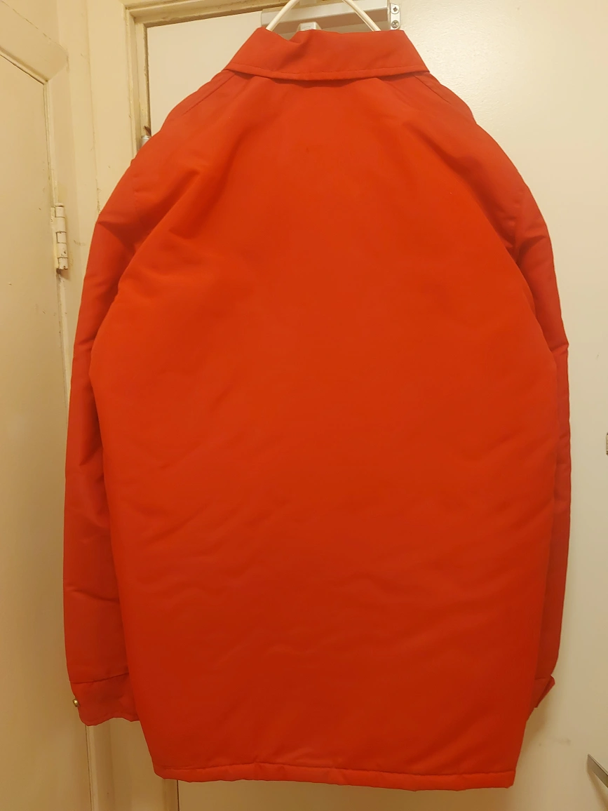 5This vibrant nylon jacket is perfect for the fall season! The item was originally thrifted and it is a size 40. It is in good condition, though when it was acquired it had some loose threads, wear on the buttons and some minor discolouration towards the collar. The jacket features several different patches and crests from youth sports teams in the GTA and in North America. As well it has a rich red colour with contrast white stripes along the sleeves.This would be a great addition to any closet! Furthermore I am glad to answer any questions and take more photos, if requested. Lastly please feel free to check out my printer studio online store with a selection of items I designed. Printer Studio Online Store Link: https://www.printerstudio.ca/sell/agyei_atelier