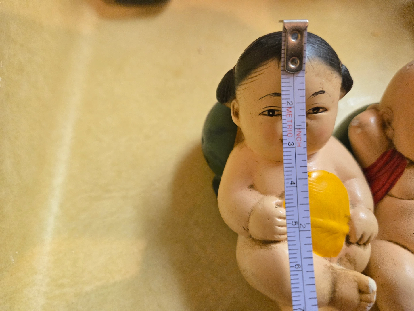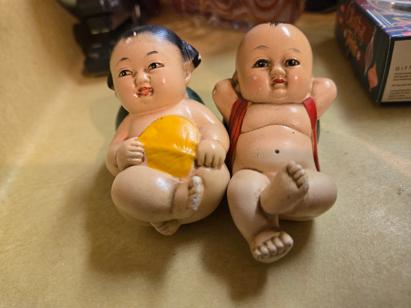 Selling a set of two vintage Asian baby figurines. They are made of ceramic and are in good condition. One figurine is holding a yellow object, and the other is wearing a red cloth. The figurines are about 7 cm long.