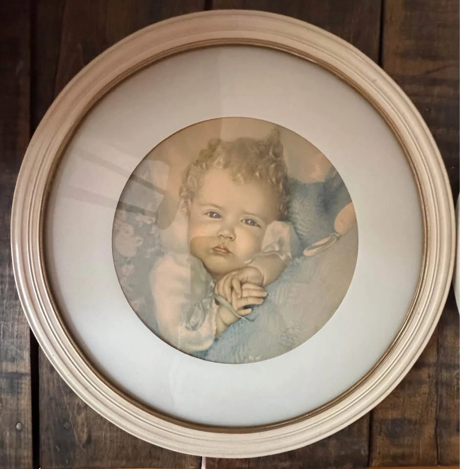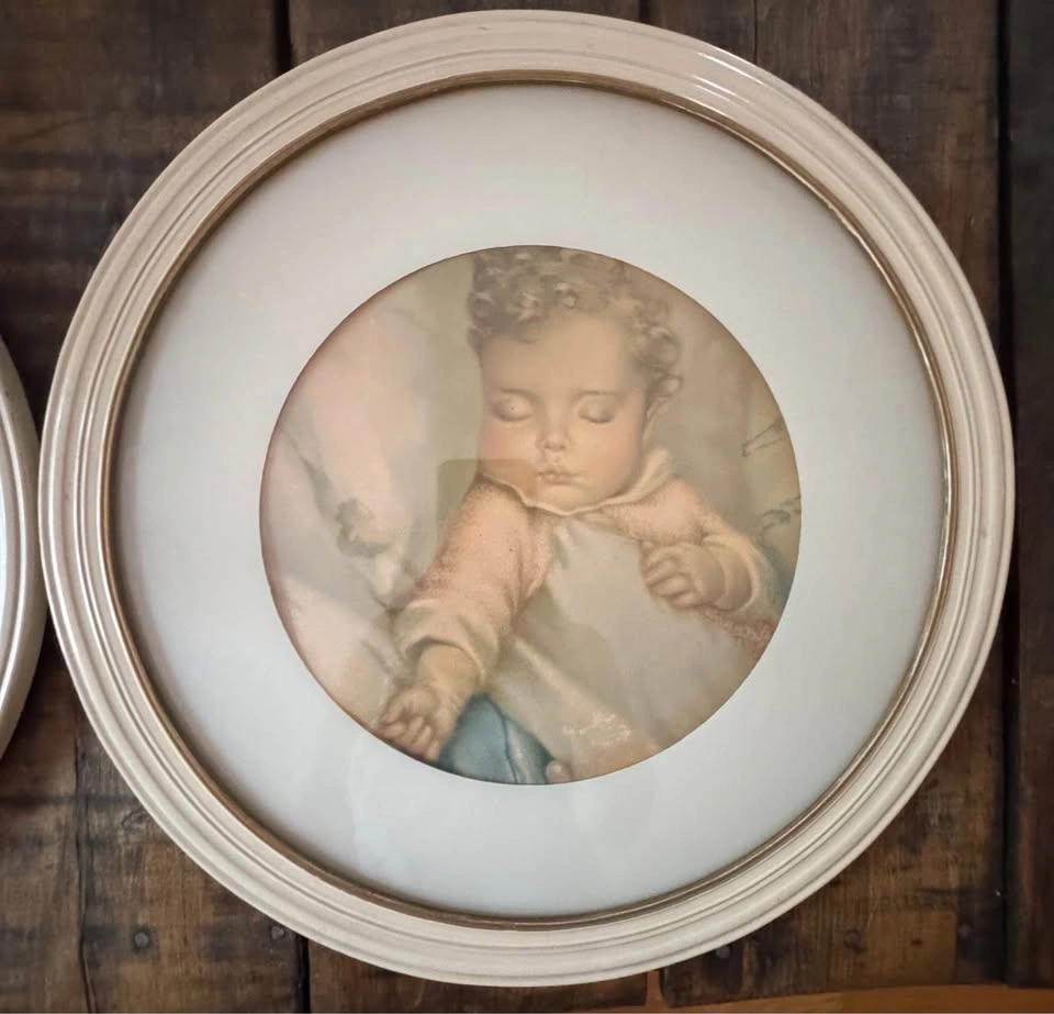 Excellent condition mid-century baby prints set of two. Cream colour with gold border on the inside. Prices for both. Pick up in Brighton.