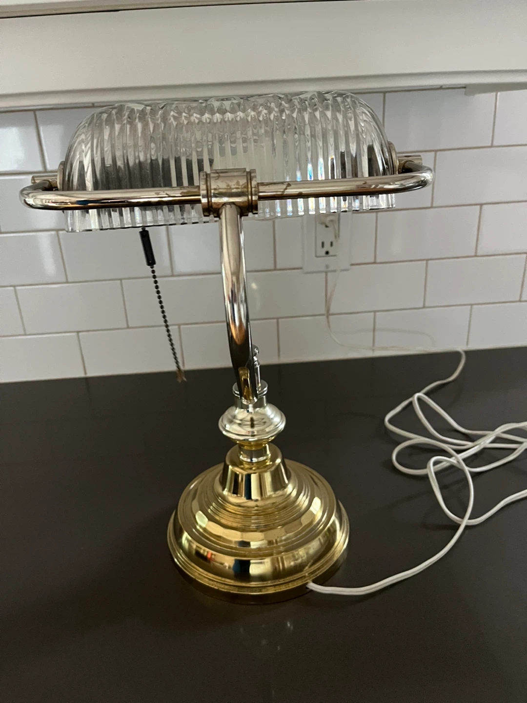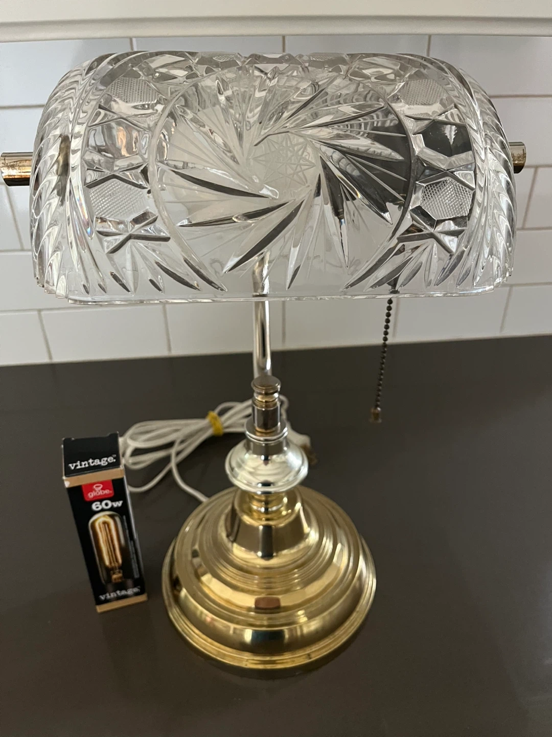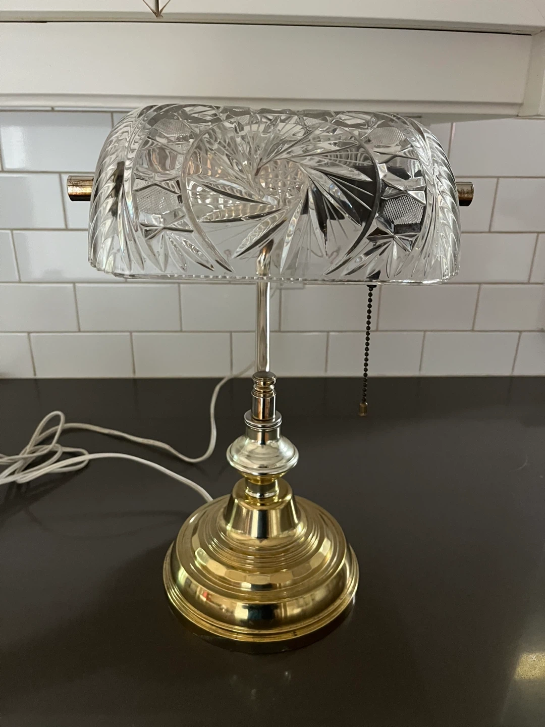 41Pick up in Utopia. Height 14.4”, width of shade 10.5”, base 6.5” in diameter. Selling a vintage banker's desk lamp. It features a beautiful Pinwheel Crystal shade and a brass base, giving it a classic and elegant look. Perfect for adding a touch of sophistication to your desk or office space! Missing felt on the bottom of the base. It includes two different light bulbs, bright white or warm white