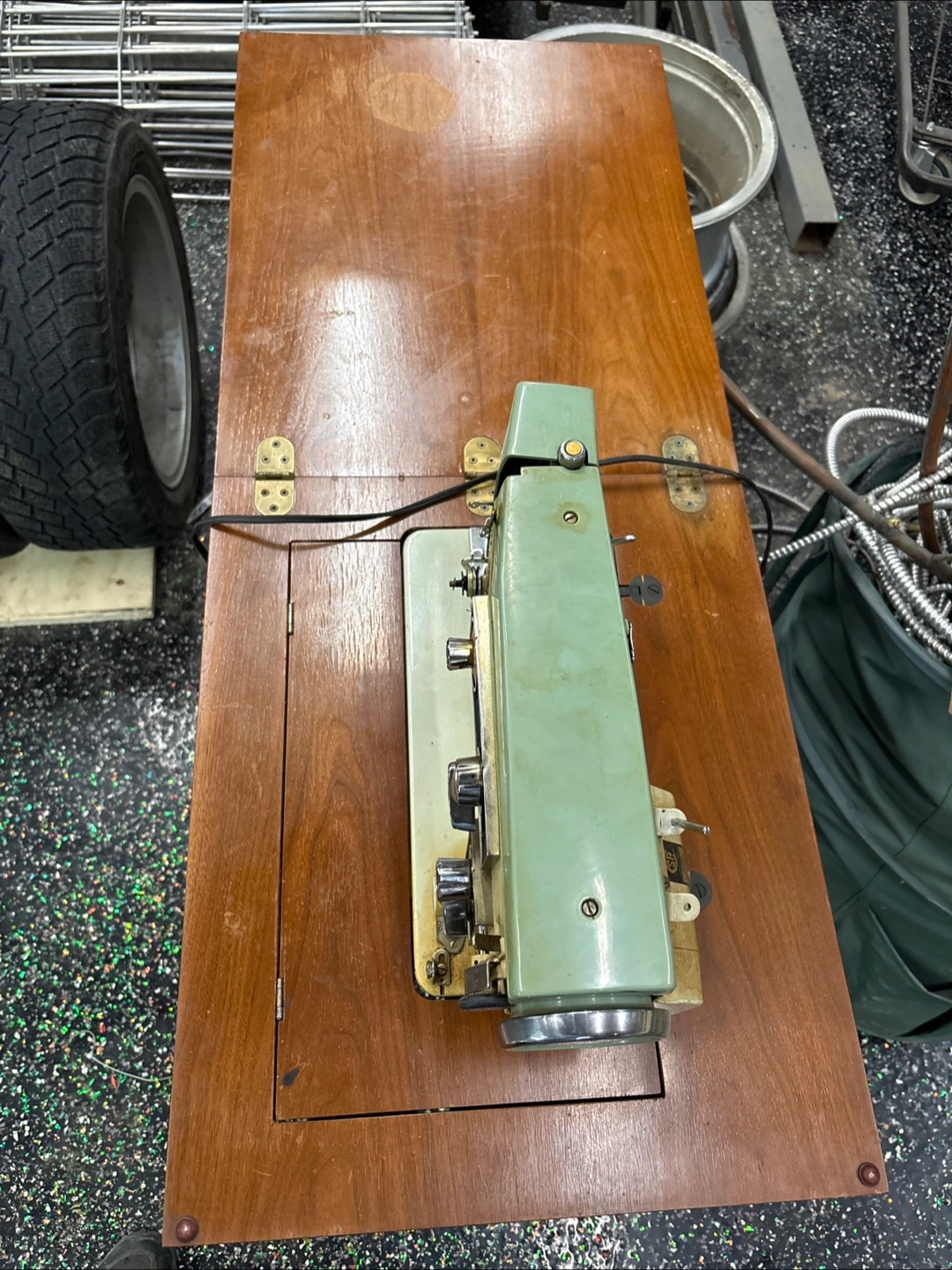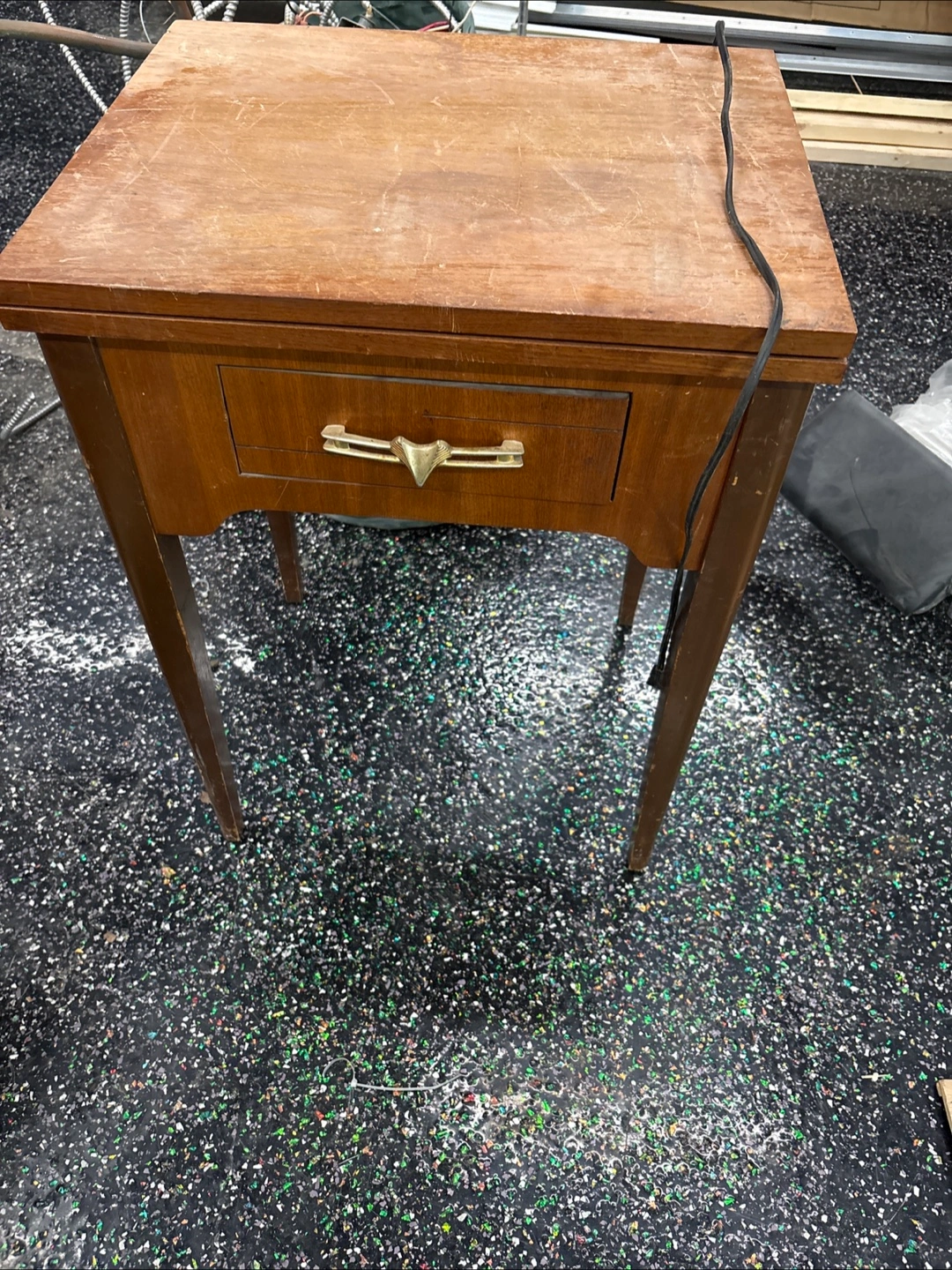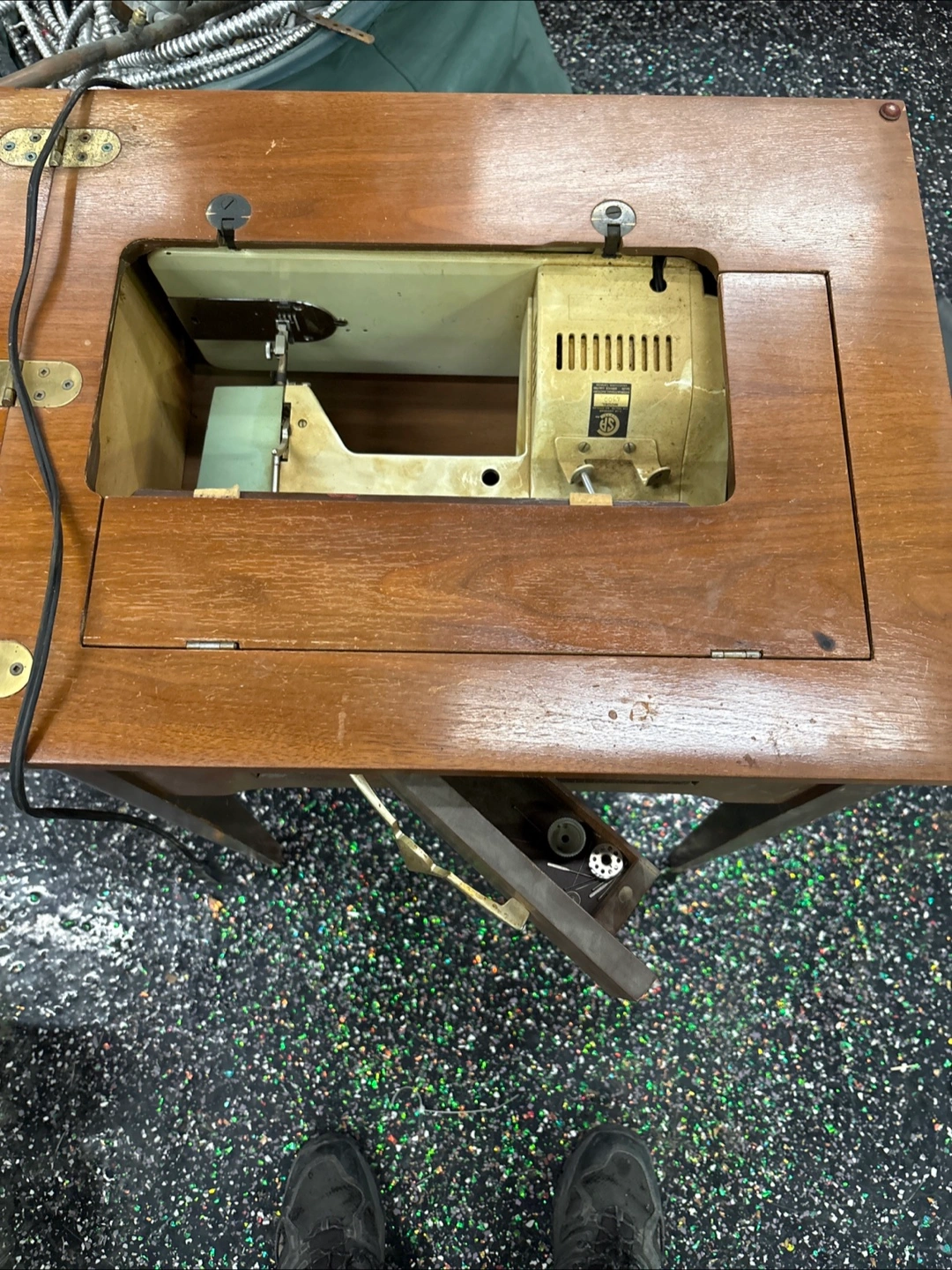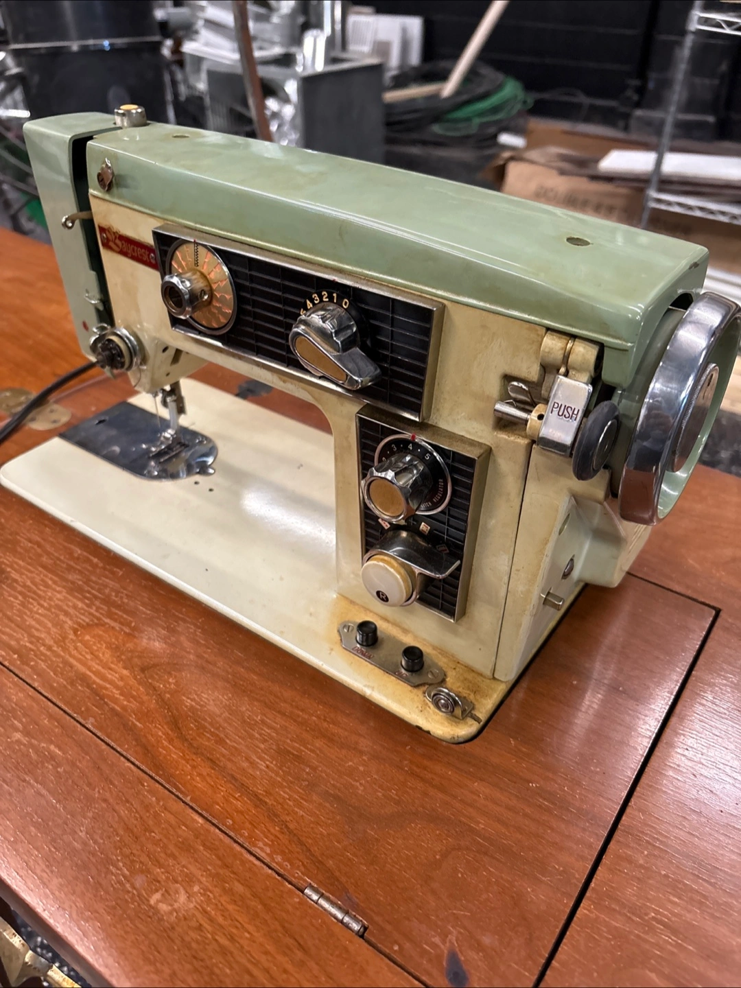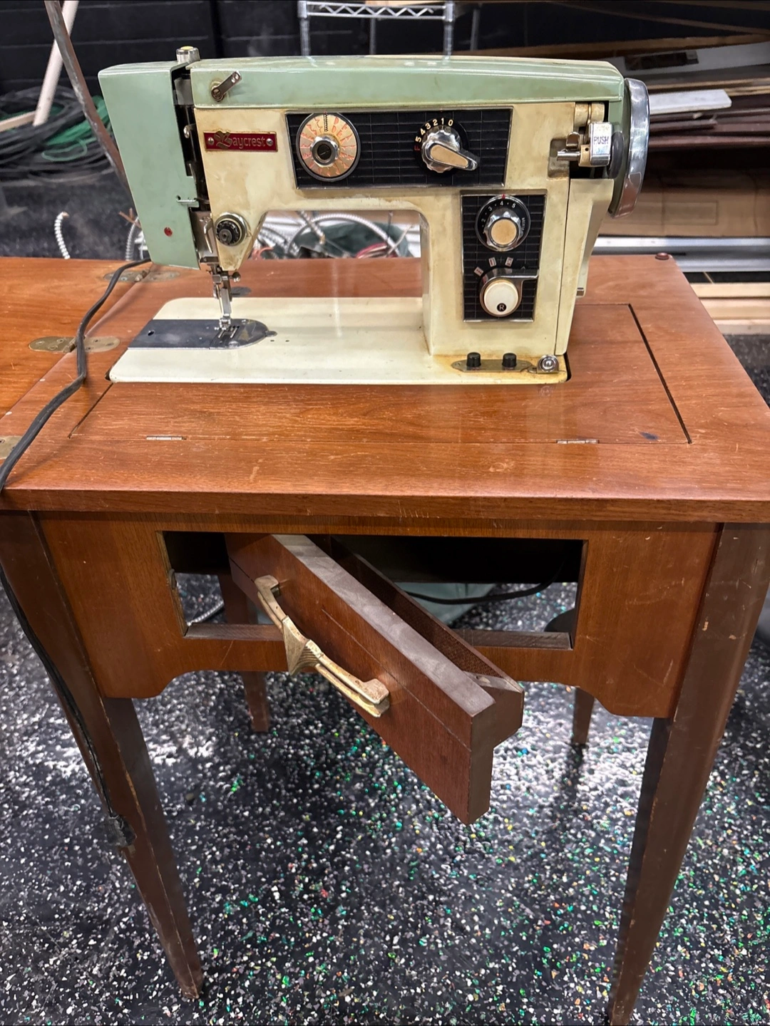 Selling a vintage Sewcrest sewing machine. It's in used condition and comes with the fold-out table. Perfect for someone who loves vintage sewing machines or wants a unique piece for their collection