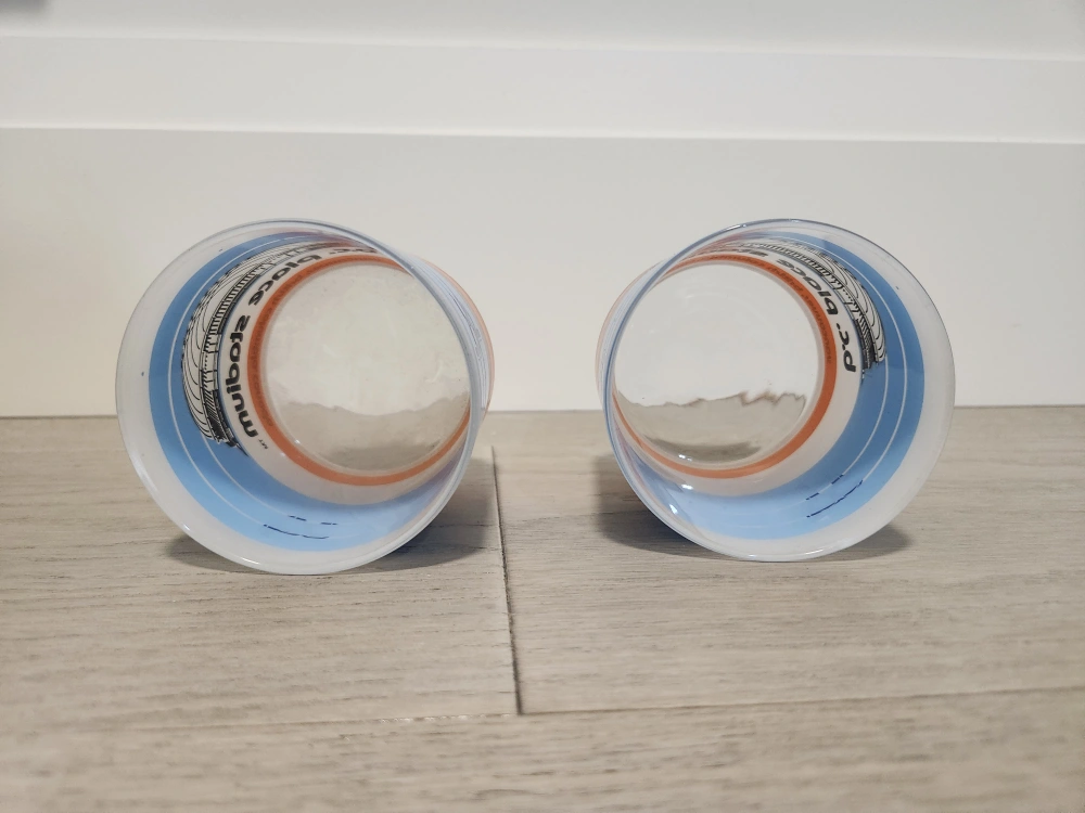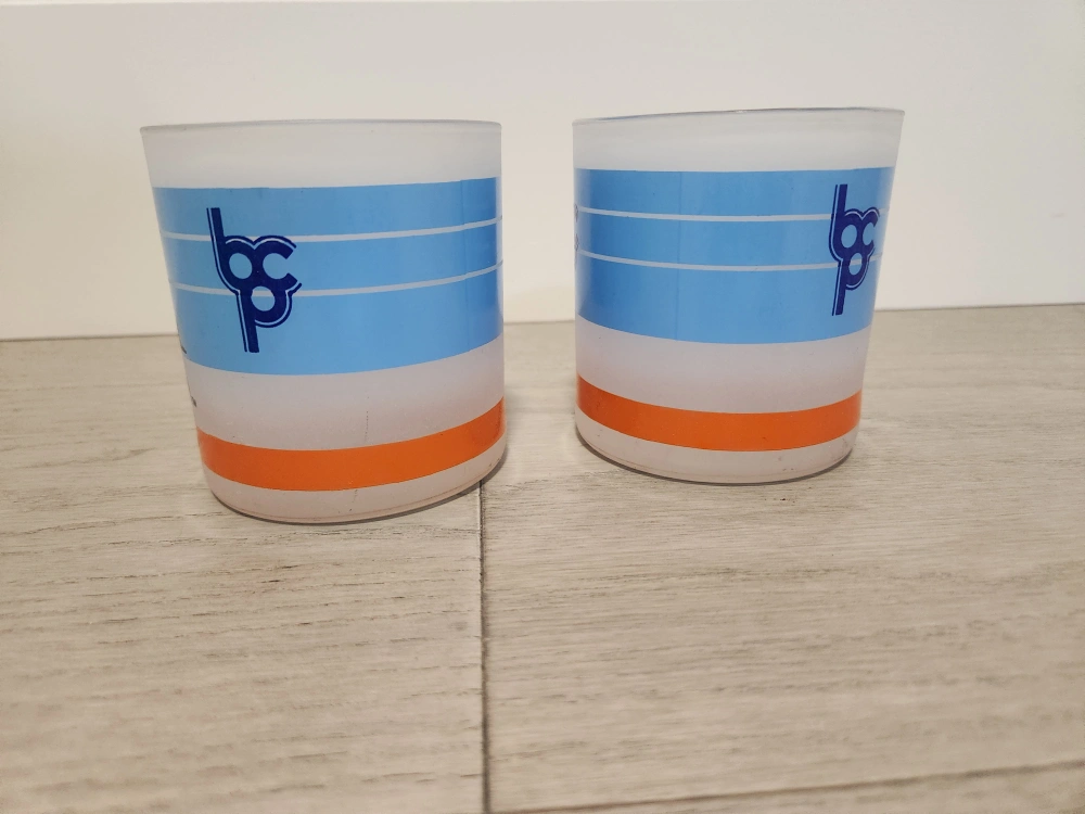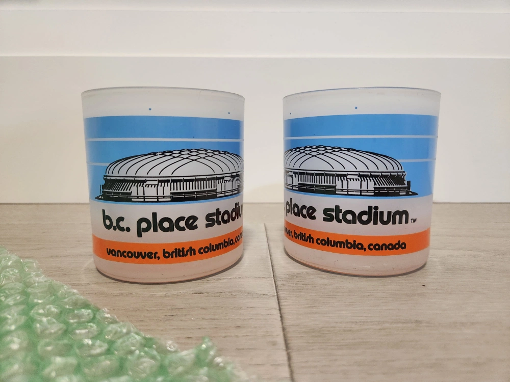 Pair of vintage BC Place Stadium souvenir cups. Frosted glass design. Blue, orange and white colour scheme. Vancouver, British Columbia location indicated.