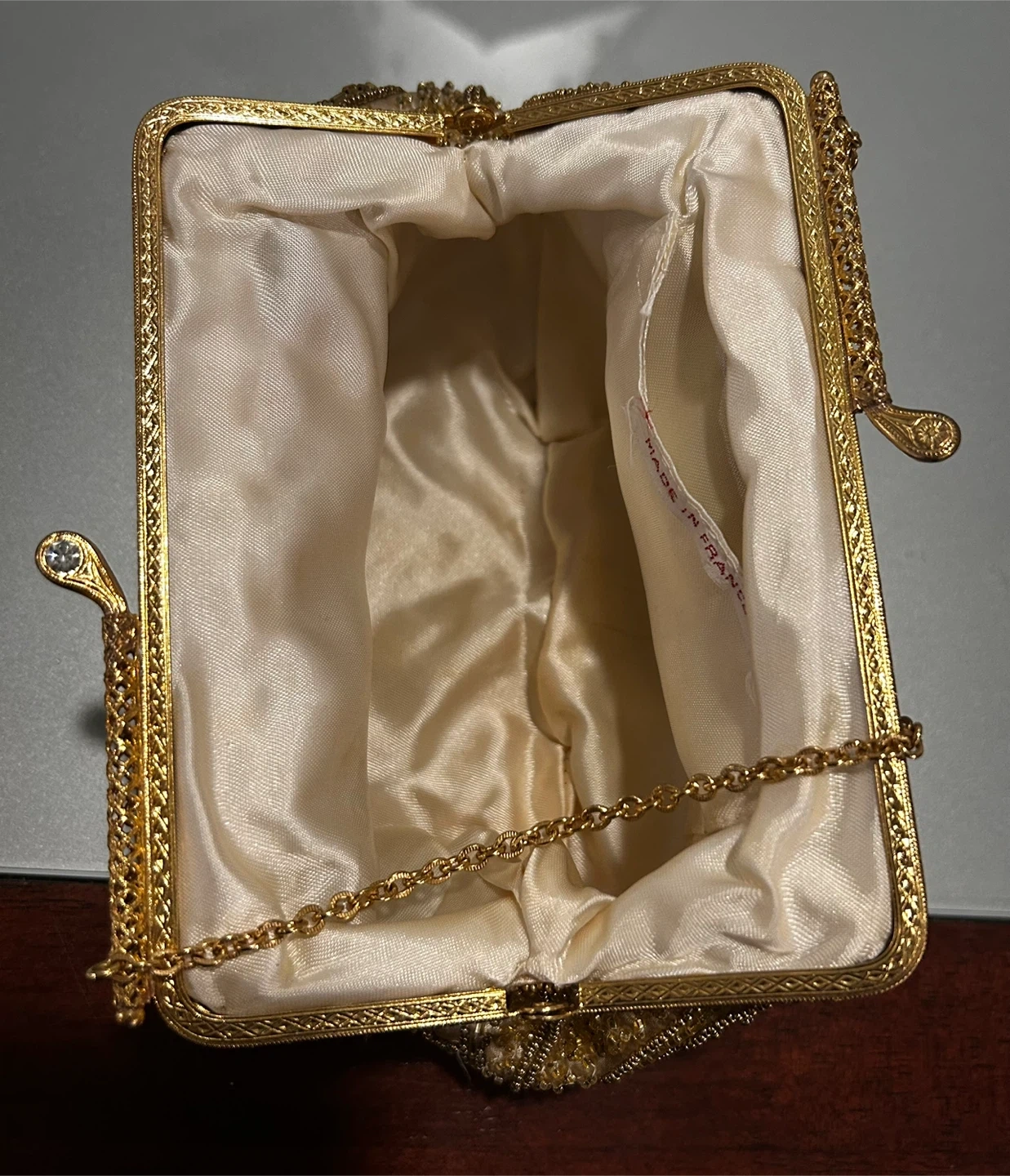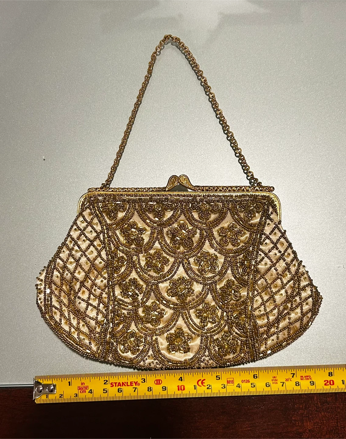 15Check out this gorgeous vintage evening bag! It's got intricate beadwork and a lovely gold chain strap. made in France. In mint condition with silk lining. Perfect for a special occasion or to add a touch of vintage glam to your outfit