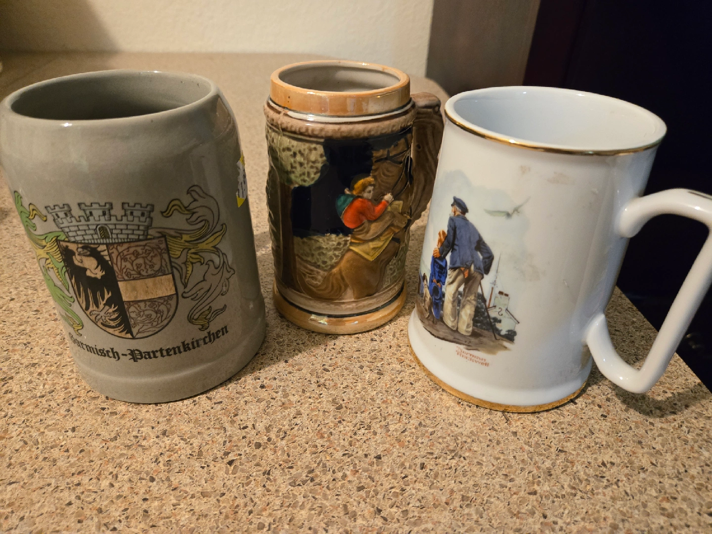 56Selling a set of three vintage beer stein mugs. One mug features a Garmisch-Partenkirchen design, another has a horse and rider, and the third features a nautical scene. Great for collectors or anyone who enjoys a good brew!