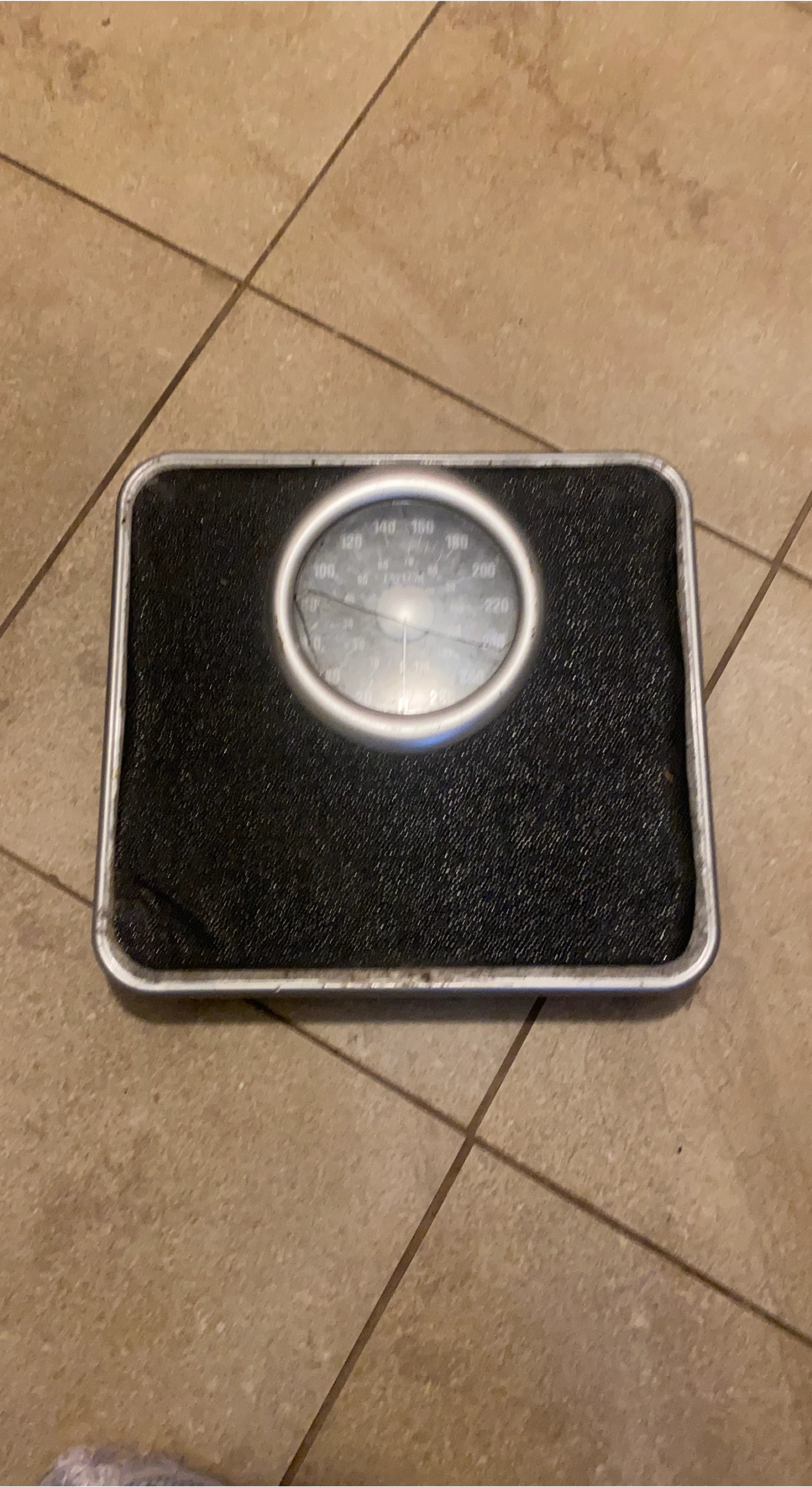Vintage bathroom scale with a black textured surface and a silver trim. Shows signs of wear and use, but still functional for measuring weight. A classic addition to any bathroom!
