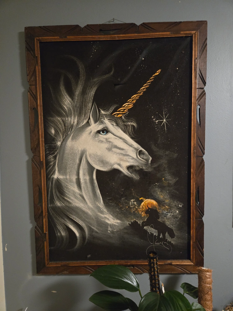 Framed black velvet painting. Features a unicorn with a gold horn. Dark background with stars and a moon. Unique piece, perfect for any home.