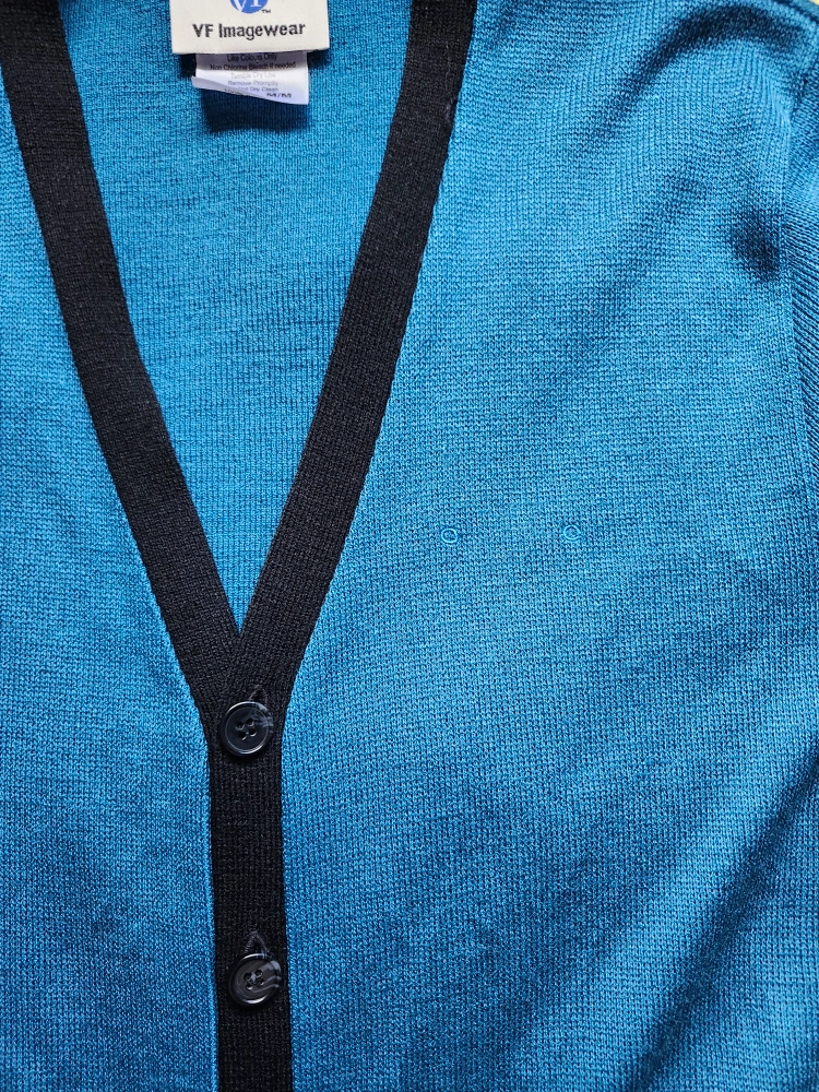 75Blue cardigan with black trim perfect staple cardigan in a tealy-blue. has two small embroidered circles on the one breast side? they blend in very well though. by the brand VF Imagewear. label size M, pit to pit laying flat is 19.5in and length from shoulder to bottom is just over 25in item is in great vintage condition with no flaws or stains that I could notice