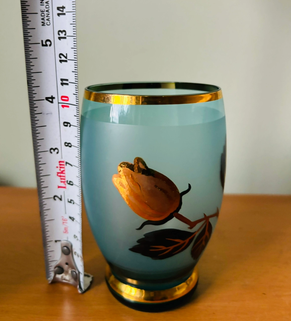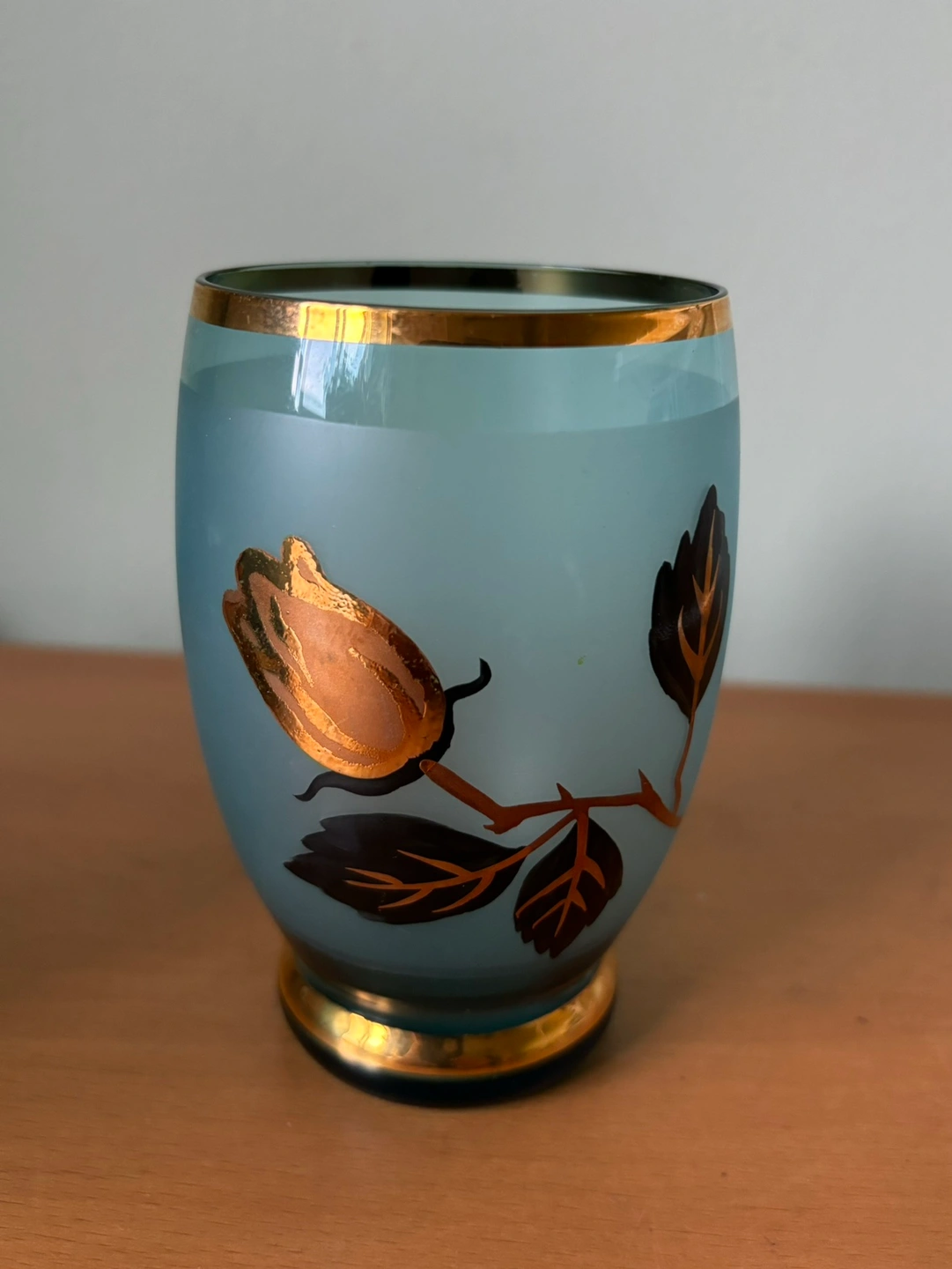 Beautiful vintage blue glass tumblers with gold accents. The tumblers have a frosted blue finish with gold trim and a gold rose design. They are in new condition with no chips or cracks. It also looks pretty in your bathroom if you use it as a toothbrush holder. $2 each. Click on my name above to see my other listings and pickup locations.
