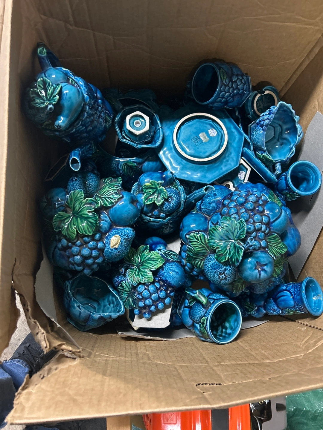 20Beautiful vintage tea set. Features a deep blue glaze with grape and leaf detailing. Includes teapot, creamer, sugar bowl, cups and saucers, and a serving plate. Some pieces may show minor wear from age.