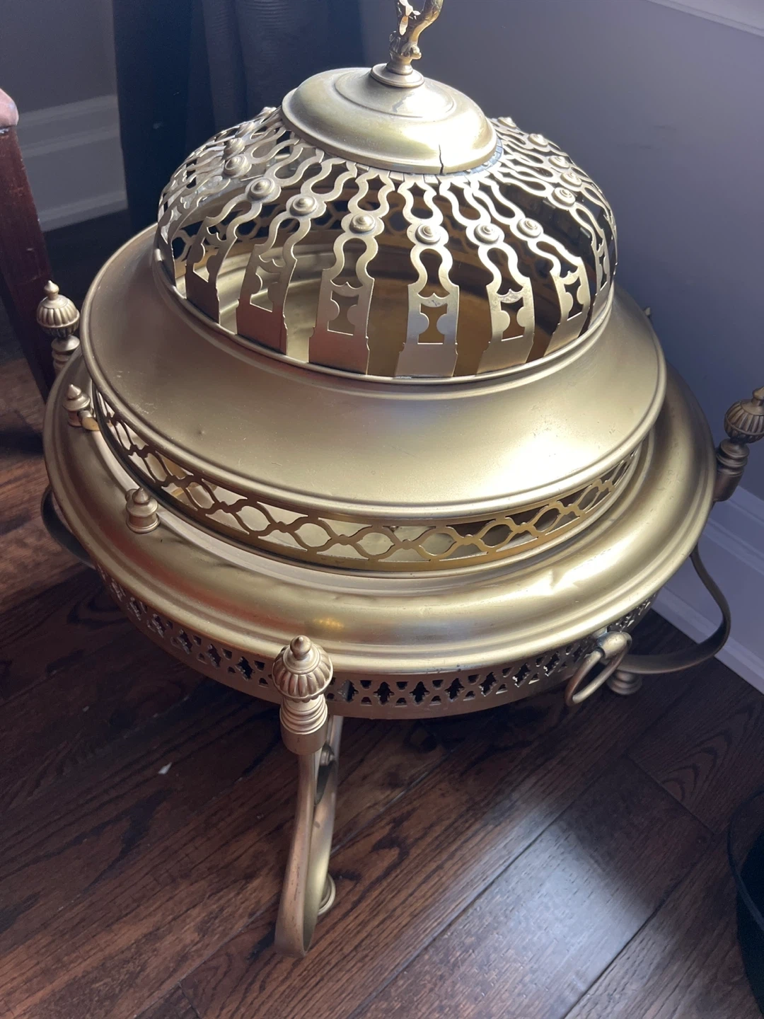 Selling a vintage brass brazier table. It has a unique design with detailed metalwork. It has a beautiful golden color and is in good condition. Perfect as a decorative piece!