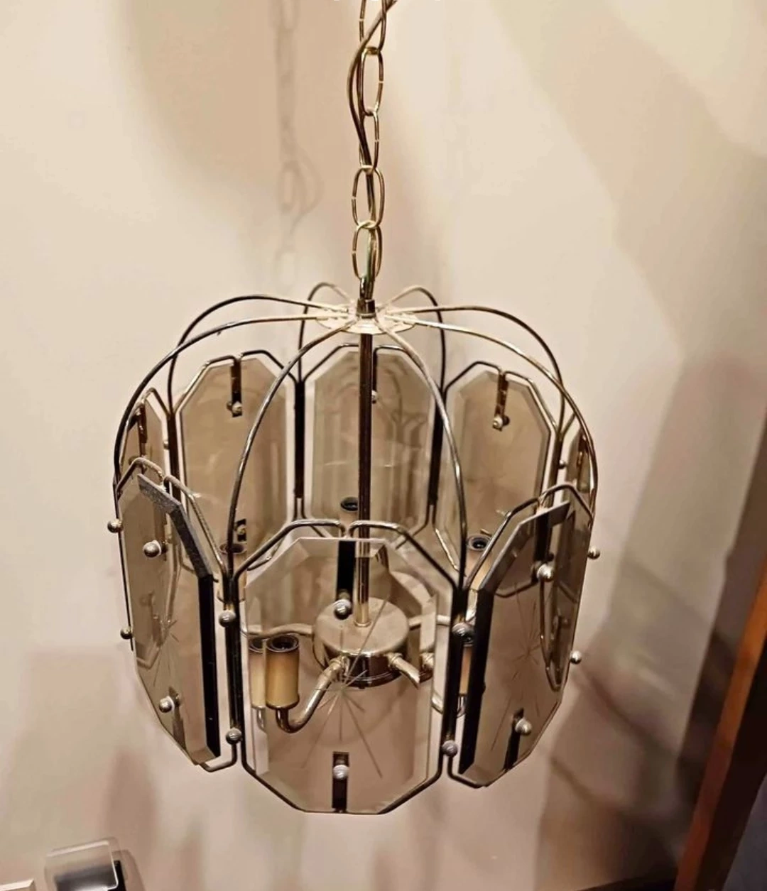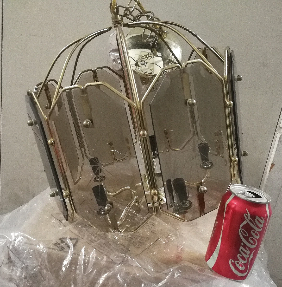 Vintage brass chandelier with 8 beveled etched smoked glass panels Star pattern etched on each glass panel need 5 small bulbs size measured with coke can (see last pic), bulbs and coke not included pick up in downtown close to St Patrick station, Dundas-University area