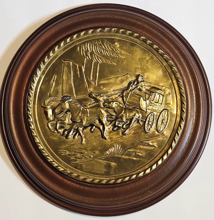 10Check out this vintage wall art featuring a brass stagecoach design! It's a unique piece with a wooden frame and intricate detailing. Perfect for adding a touch of old-world charm to your home decor