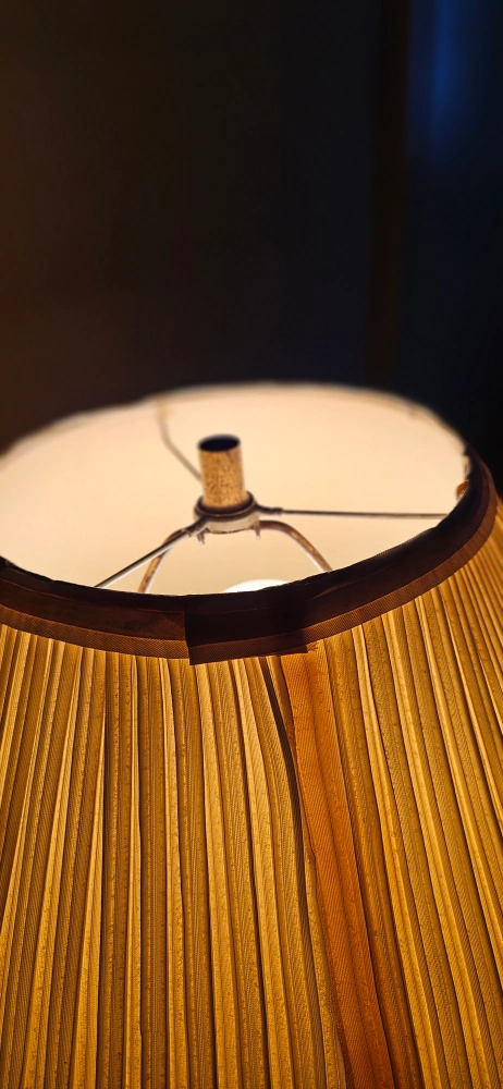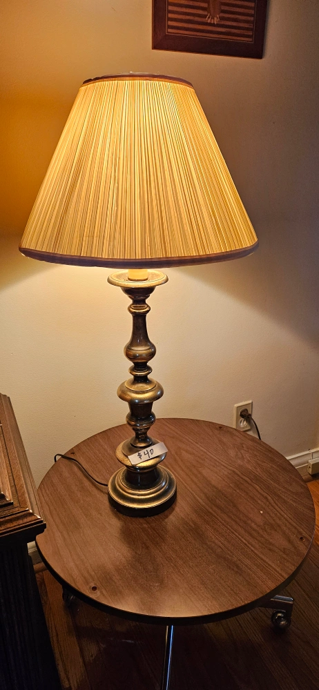 Beautiful vintage table lamp. Brass body and base. Pleated beige lampshade. Shows some signs of age and wear. Approximately 35" tall.