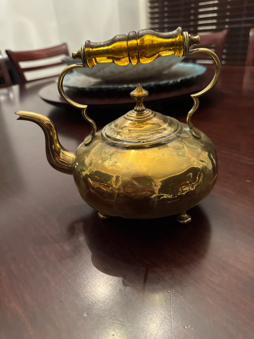 60Selling a charming vintage brass teapot! It has a unique amber-coloured handle and a lovely, classic design. Perfect for adding a touch of elegance to your tea time