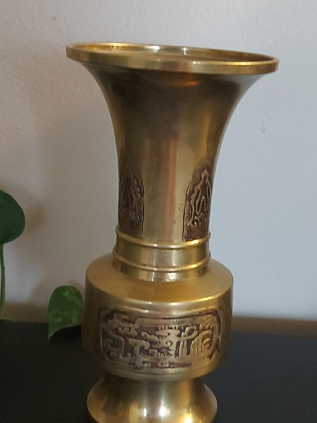 Selling a vintage brass vase. It has some cool engravings on it. It's a nice piece for decoration!