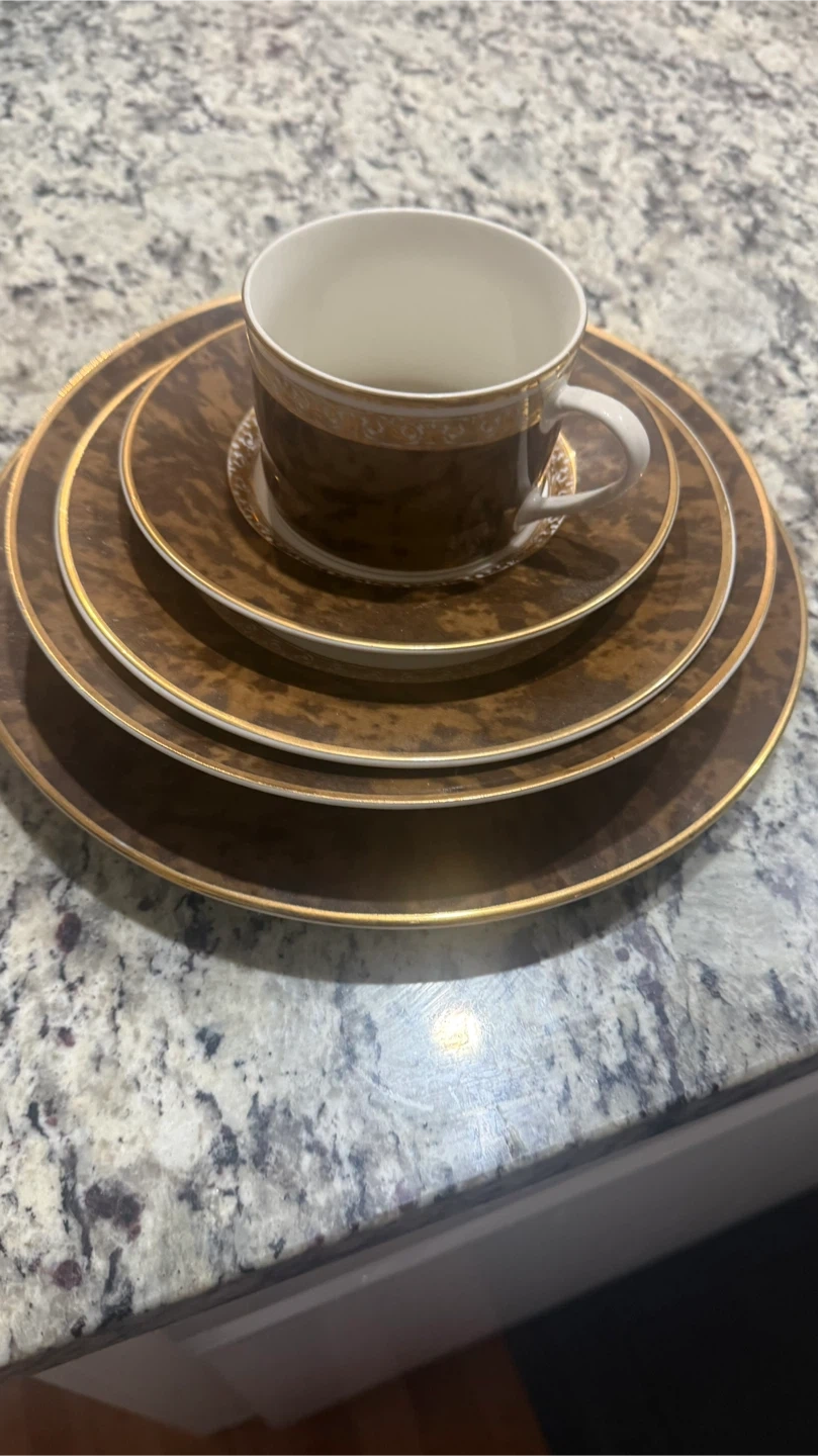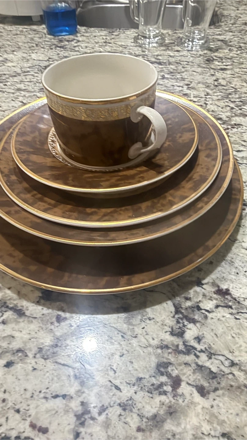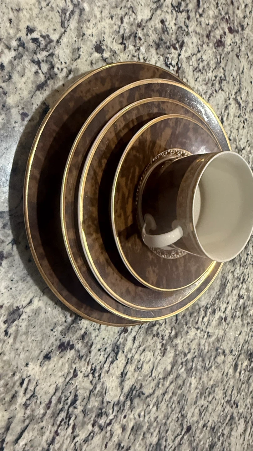 10Selling a lovely vintage china set in a brown and gold colour scheme. It includes a cup and several plates of varying sizes. Perfect for adding a touch of elegance to your dining experience! 5 place setting x12