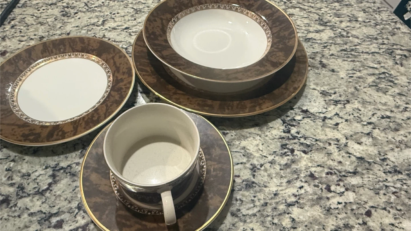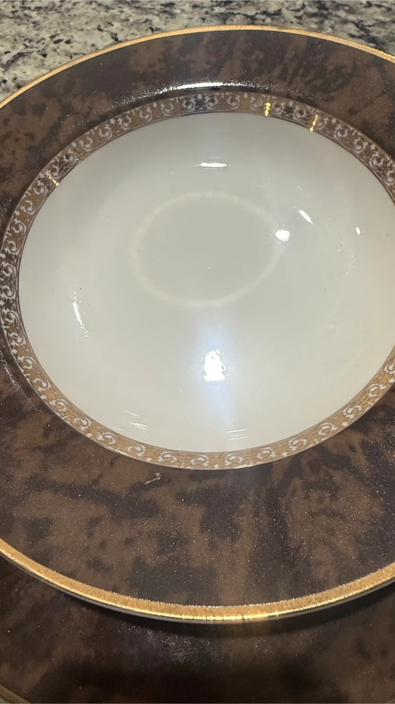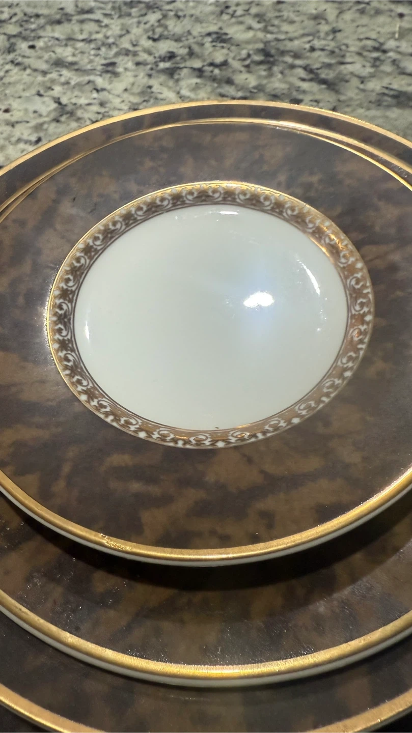 10Selling a lovely vintage china set in a brown and gold colour scheme. It includes a cup and several plates of varying sizes. Perfect for adding a touch of elegance to your dining experience! 5 place setting x12