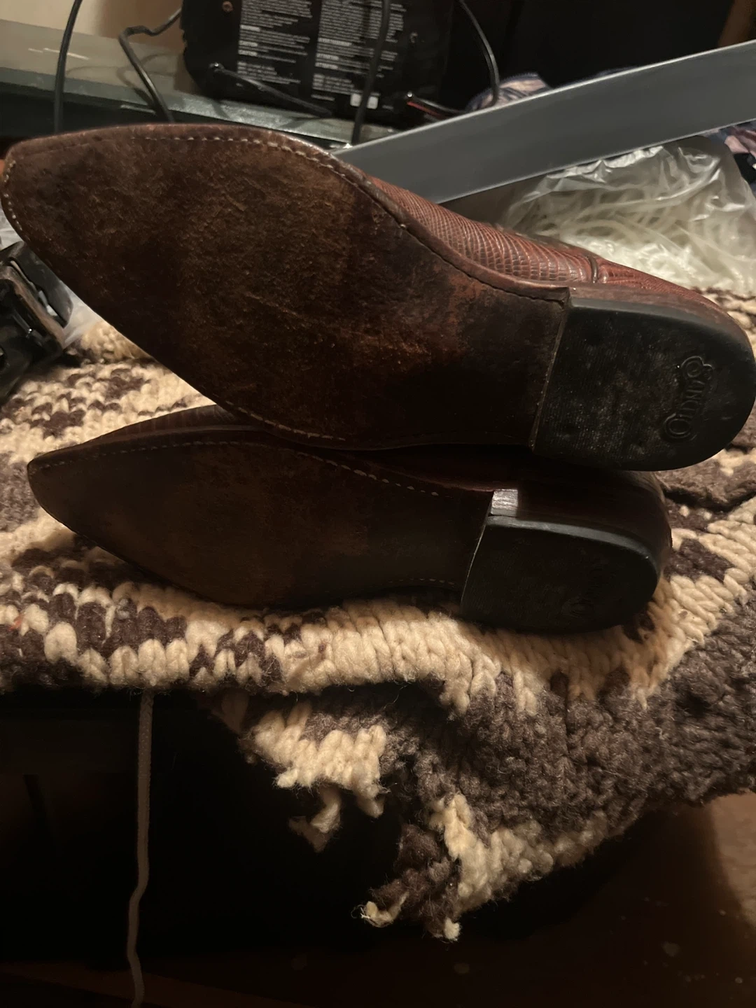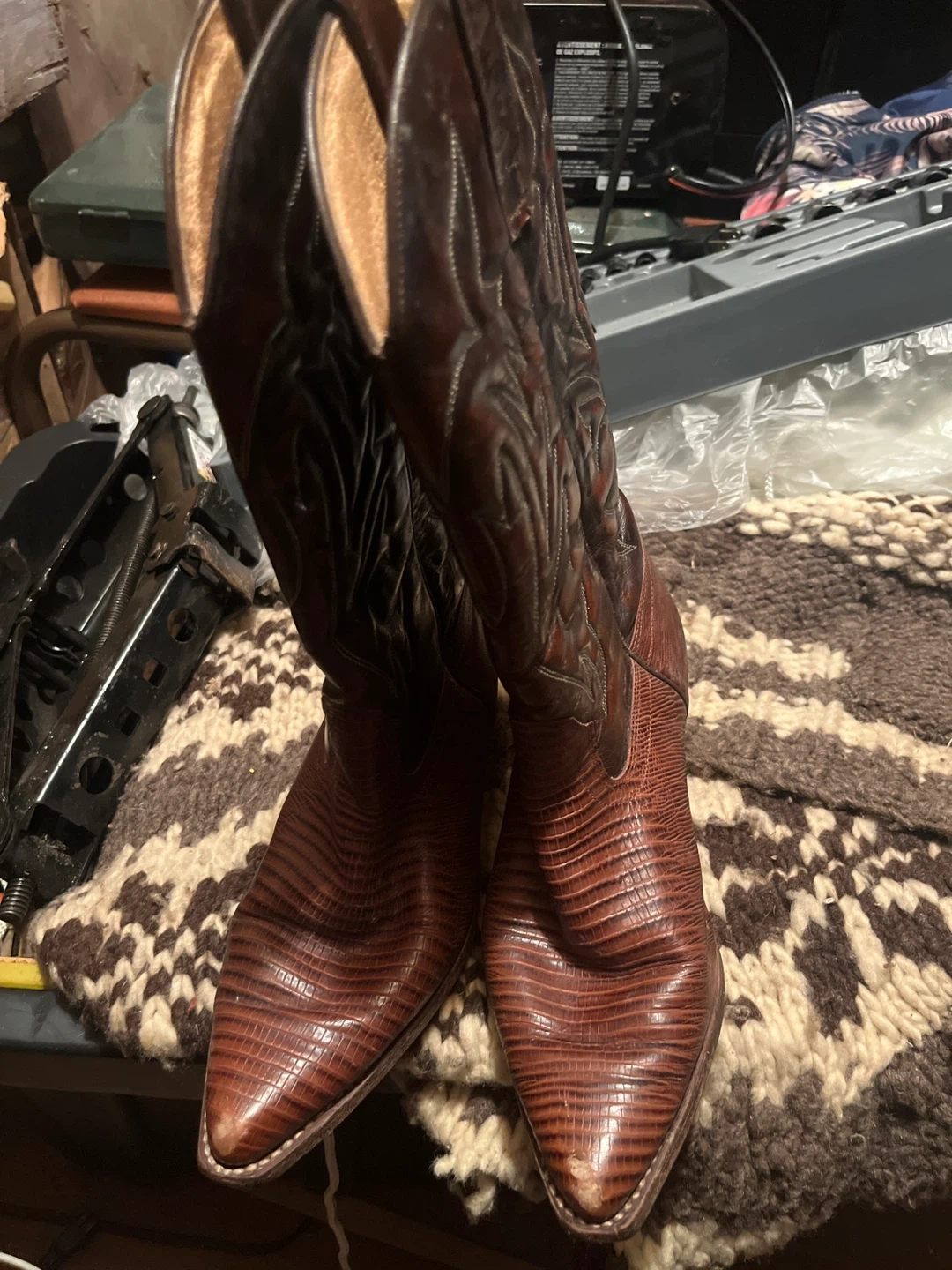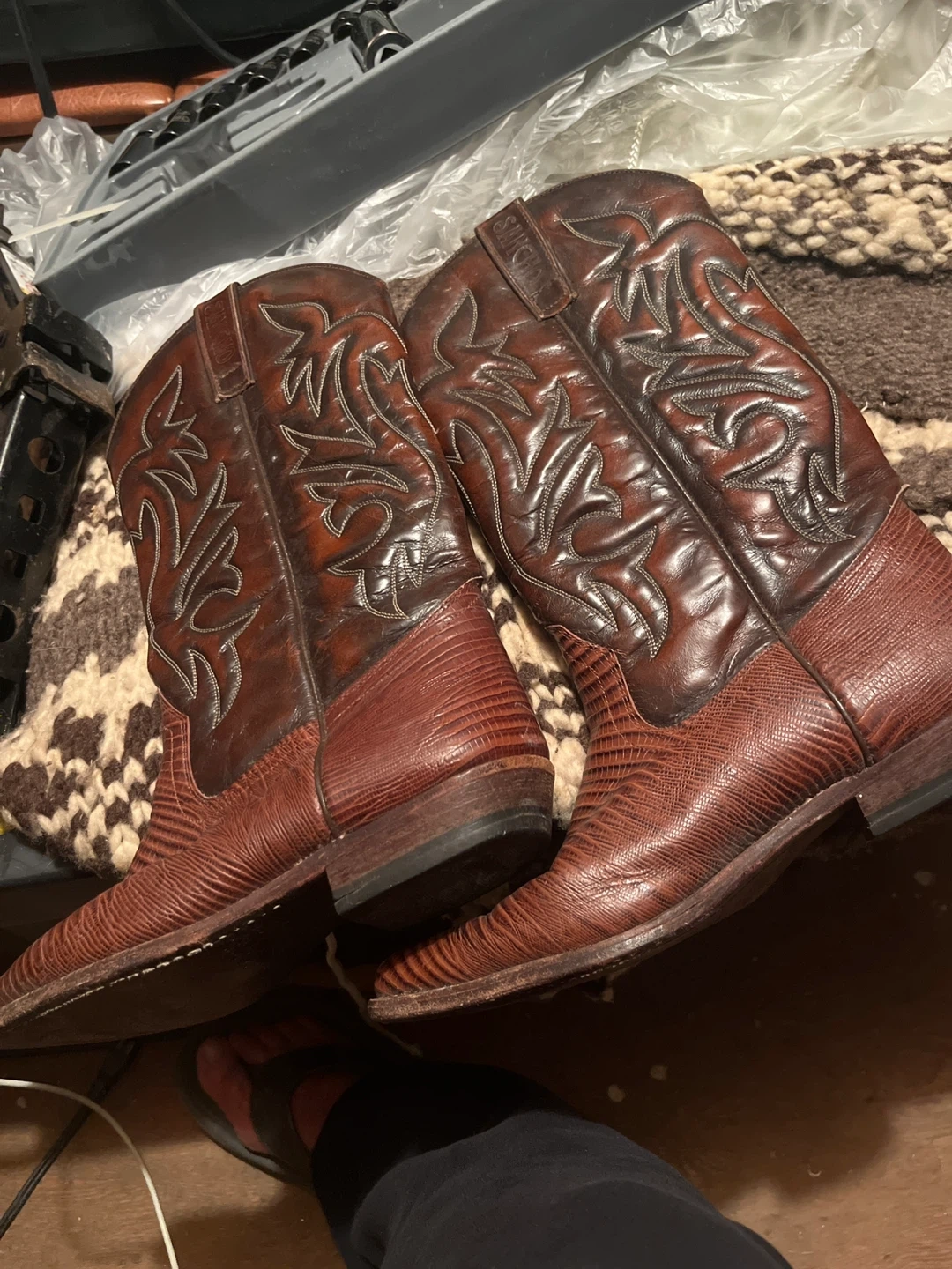 These vintage brown leather cowboy boots have a unique textured design. They're in good condition and ready for a new home! Perfect for adding a touch of Western flair to your wardrobe