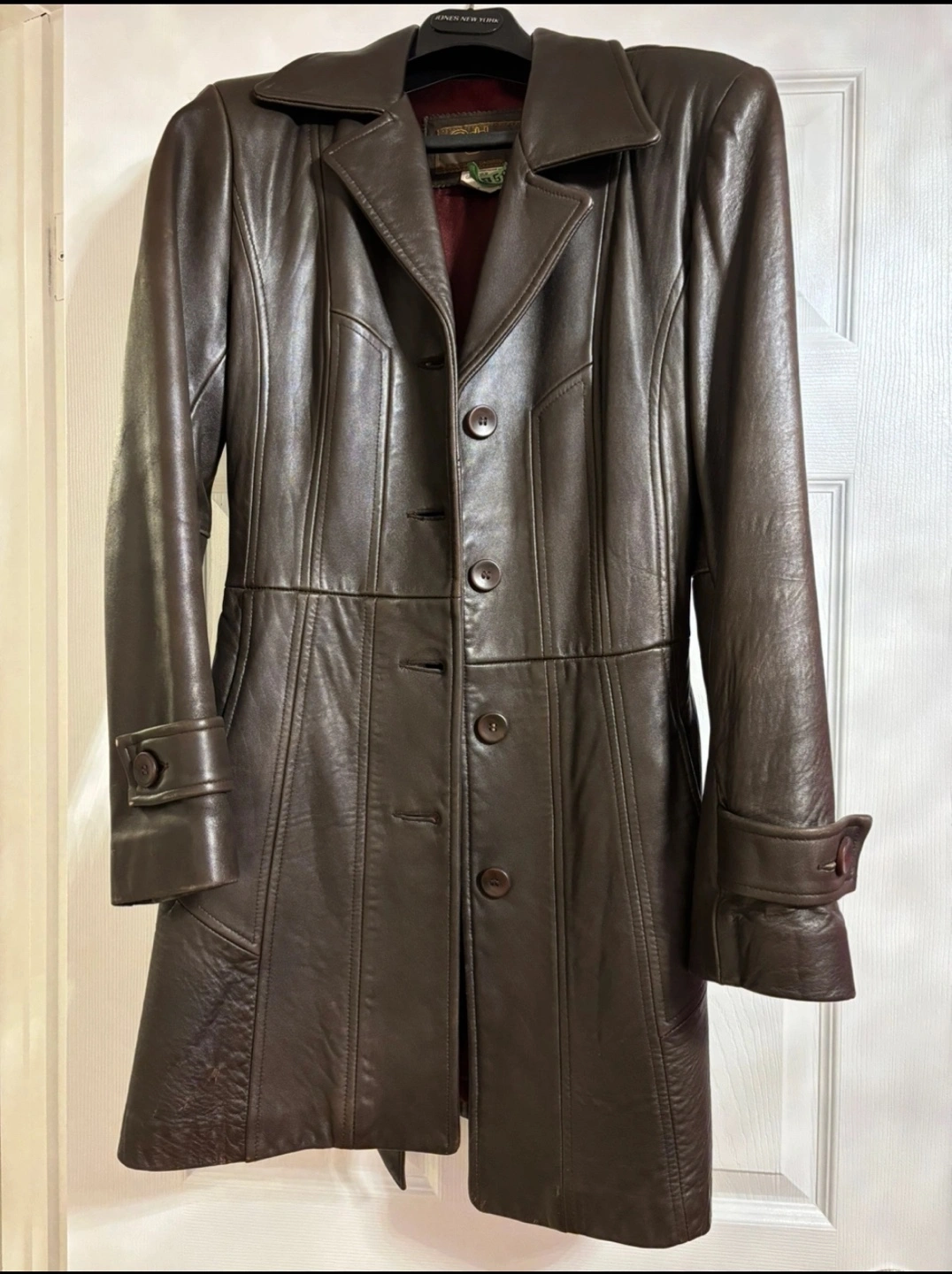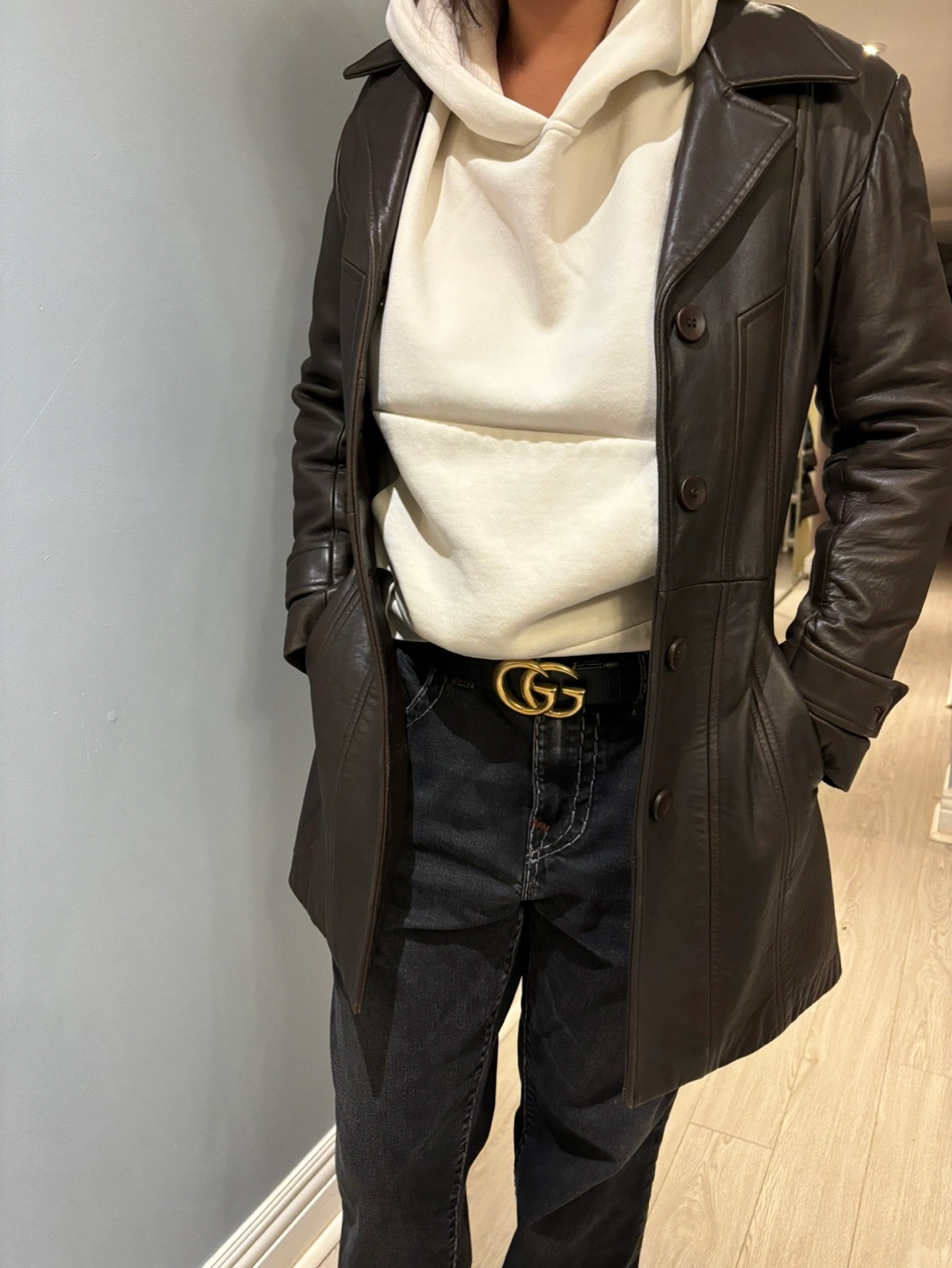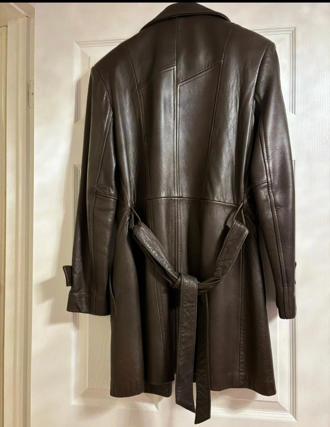 331Brown leather trench coat. Has pockets and a belt. Made in Canada. Model is 5’6. Jacket already dry cleaned