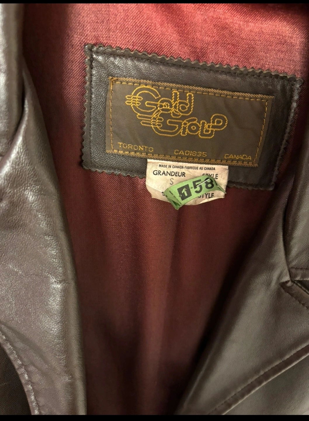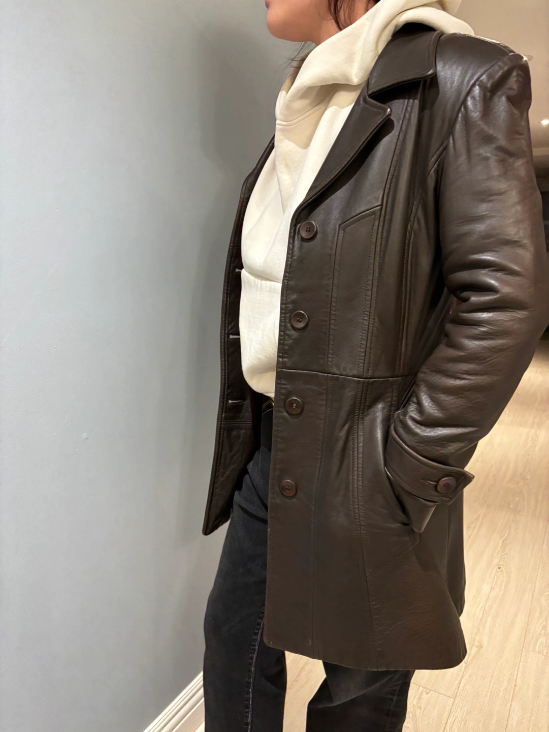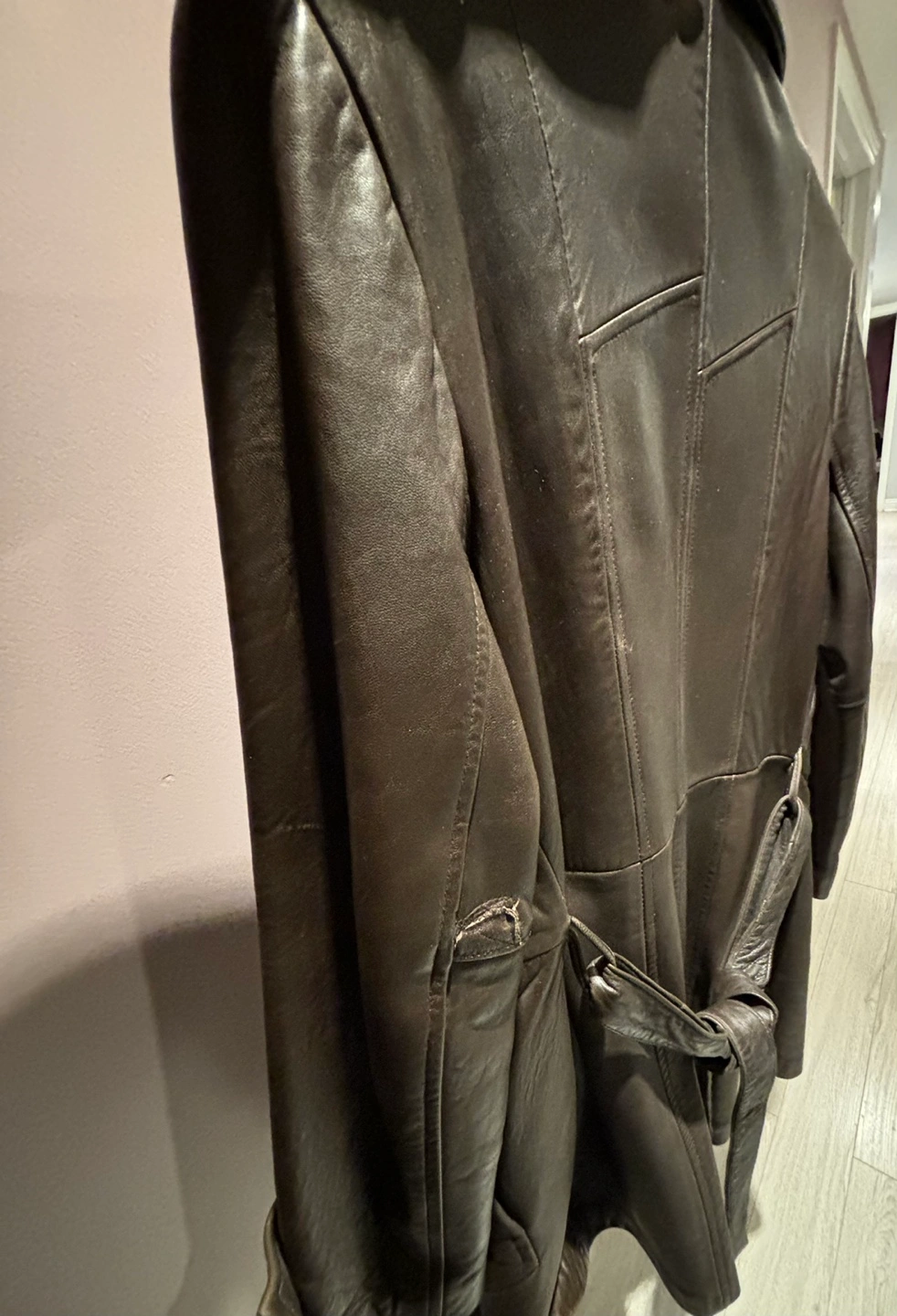 331Brown leather trench coat. Has pockets and a belt. Made in Canada. Model is 5’6. Jacket already dry cleaned