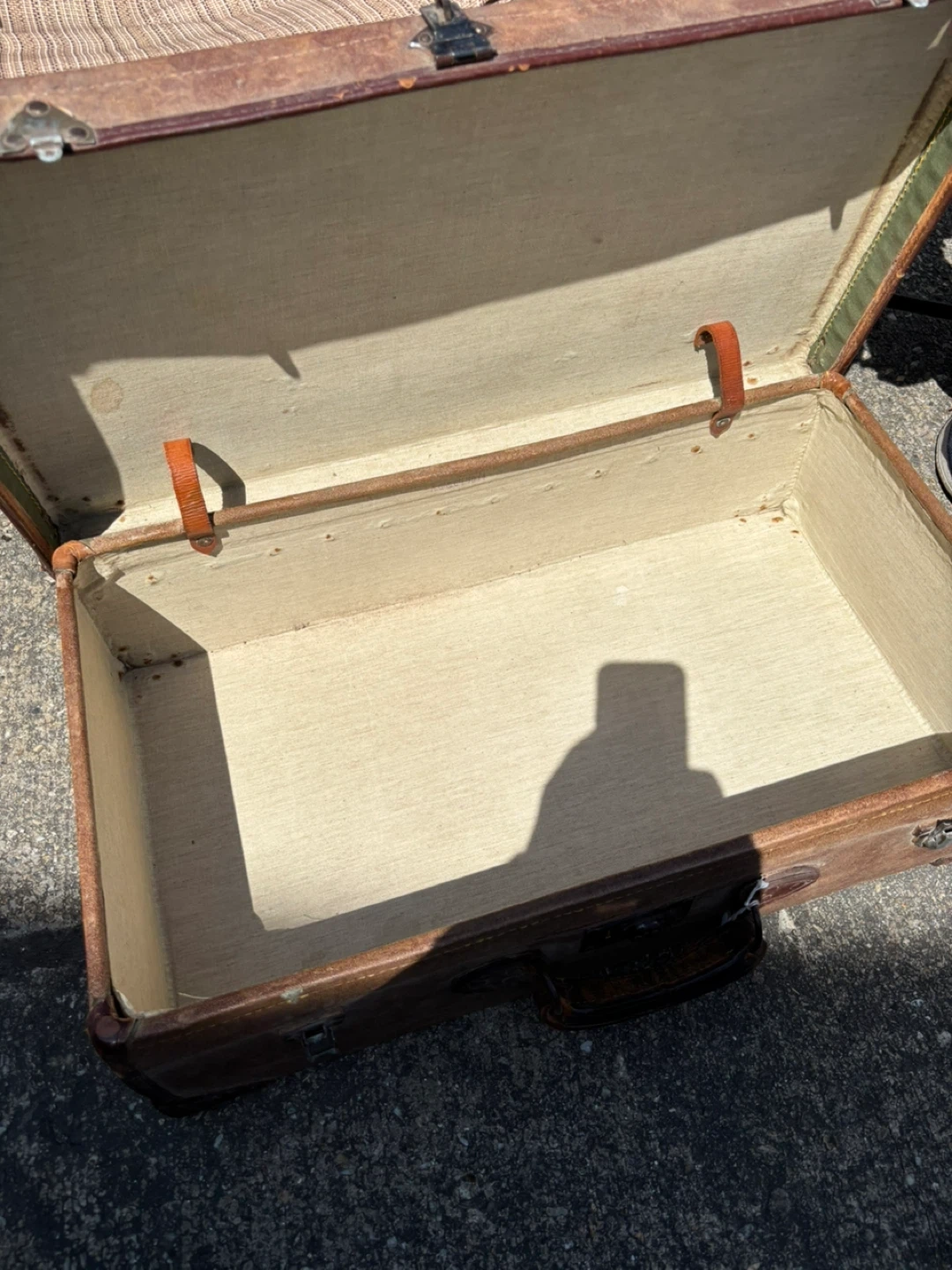 Selling a vintage brown leather suitcase. It has a classic look and is in good condition for its age. Perfect for adding a touch of retro charm to your travels or as a decorative piece. Date inside 1945
