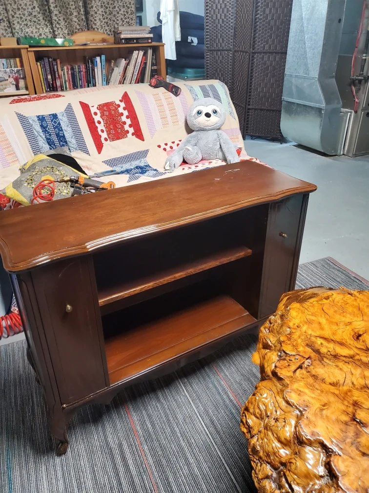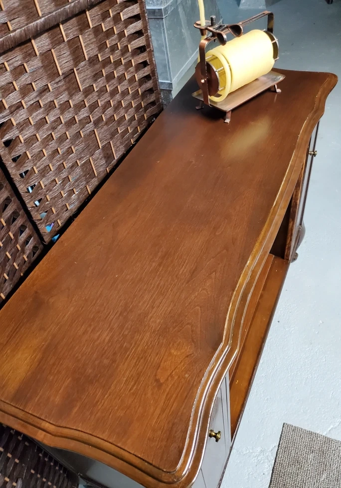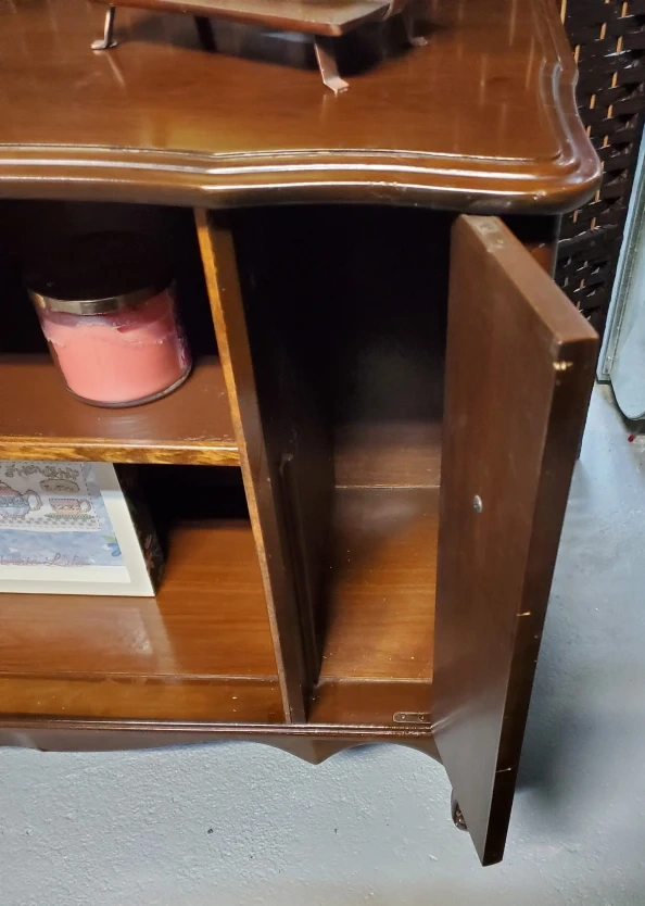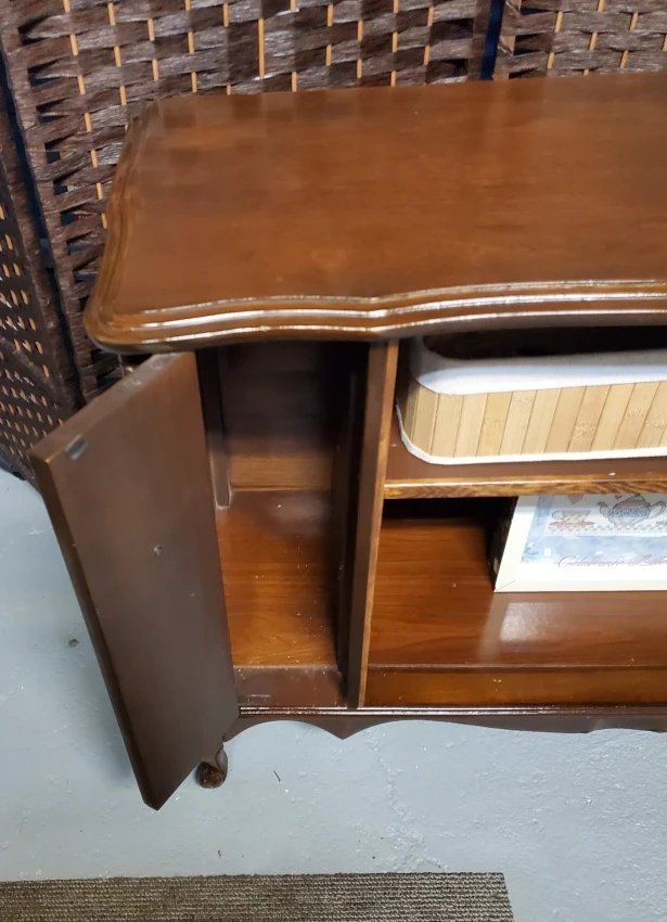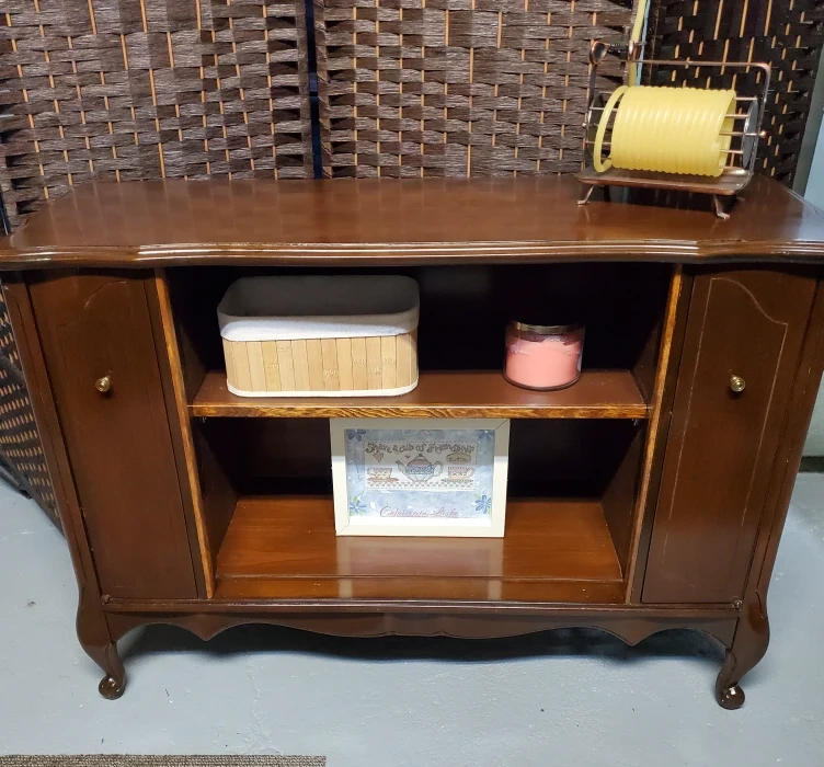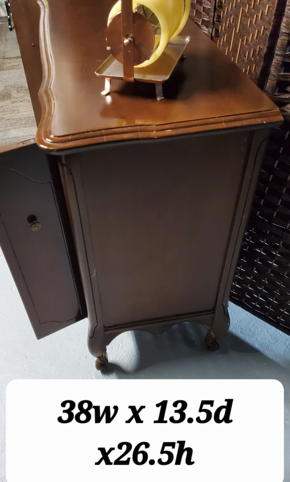 55Here's a lovely brown wood cabinet that could be just what you're looking for! Its dimensions are 38 inches wide, 13.5 inches deep, and 26.5 inches high. Refinishe. Pleanty of shelf space. Great coffee station or bar