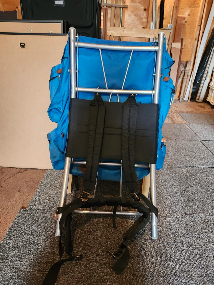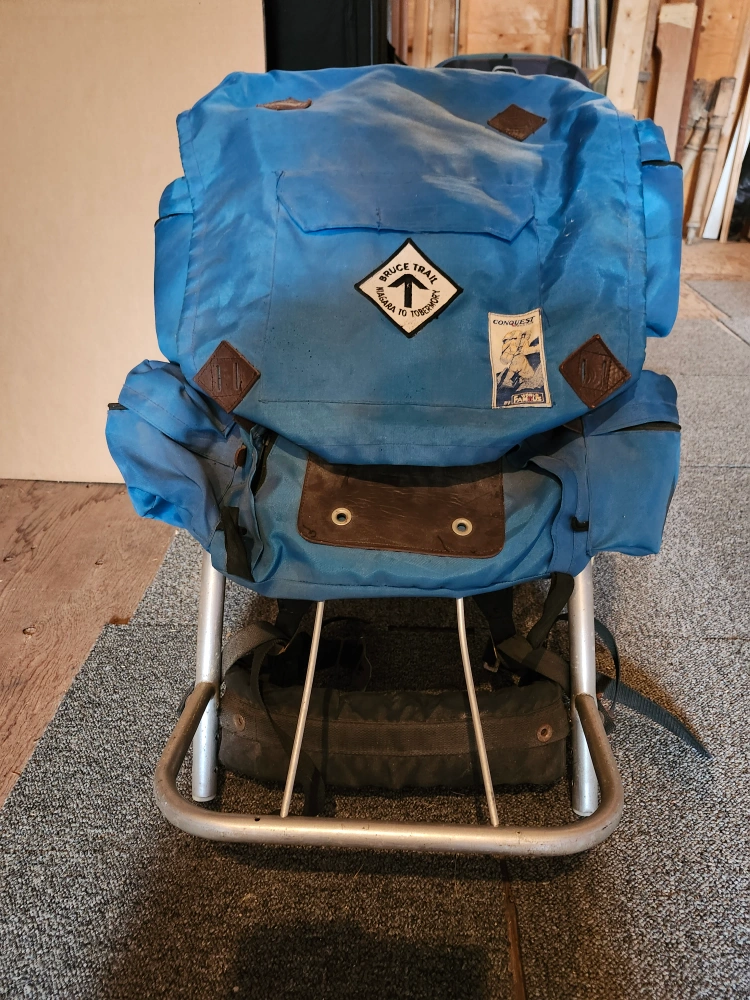 Selling a vintage Bruce Trail Conquest backpack. It features a blue nylon pack with a metal frame. This backpack is perfect for hiking and outdoor adventures! It does show some signs of wear, but it is still functional and ready for your next adventure