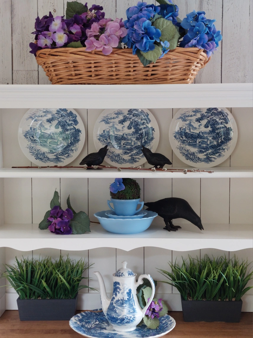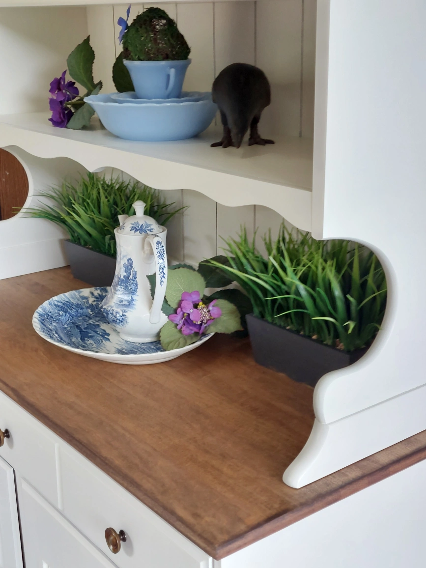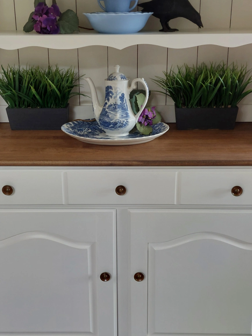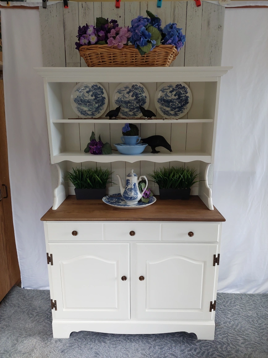 10Vintage Cottage style Buffet and Hutch. Solid wood painted in a durable warm white with medium brown stained top. Bead board back. Lower compartment has one fixed shelf. Located in the Properties area of North Cowichan - Maple Bay east side of Duncan