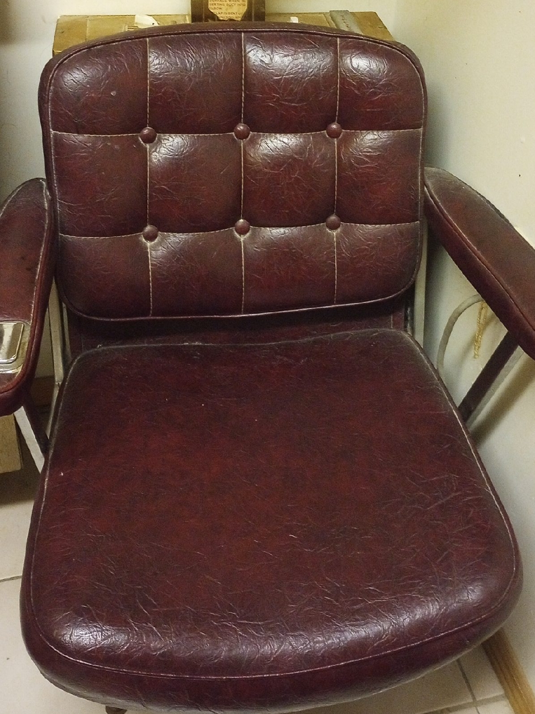 10Selling a vintage barber chair with a burgundy leather finish! It has a classic, tufted design. This chair would be a great addition to a salon or even as a unique piece of furniture for your home