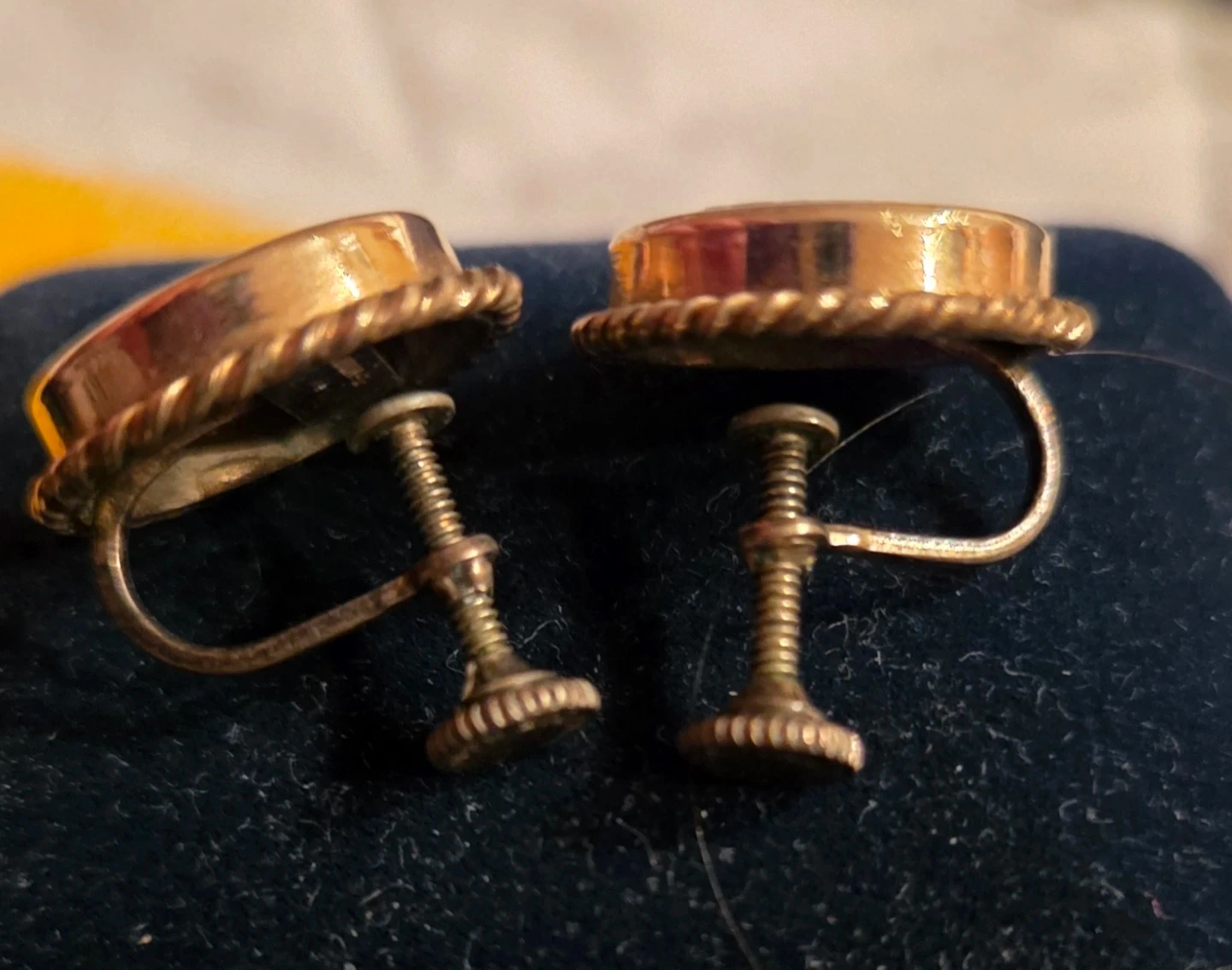 43Selling a pair of vintage cameo earrings. They have a gold-tone setting with intricate detailing. The screw-back style makes them secure and comfortable to wear. Great for adding a touch of classic elegance to any outfit! Heritage earrings