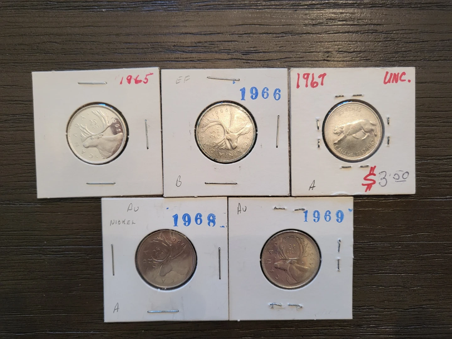 151Selling a collection of vintage Canadian coins from the years 1965, 1966, 1967, 1968, and 1969. Each coin is individually packaged. 1965 to 1967 have melt value. $30