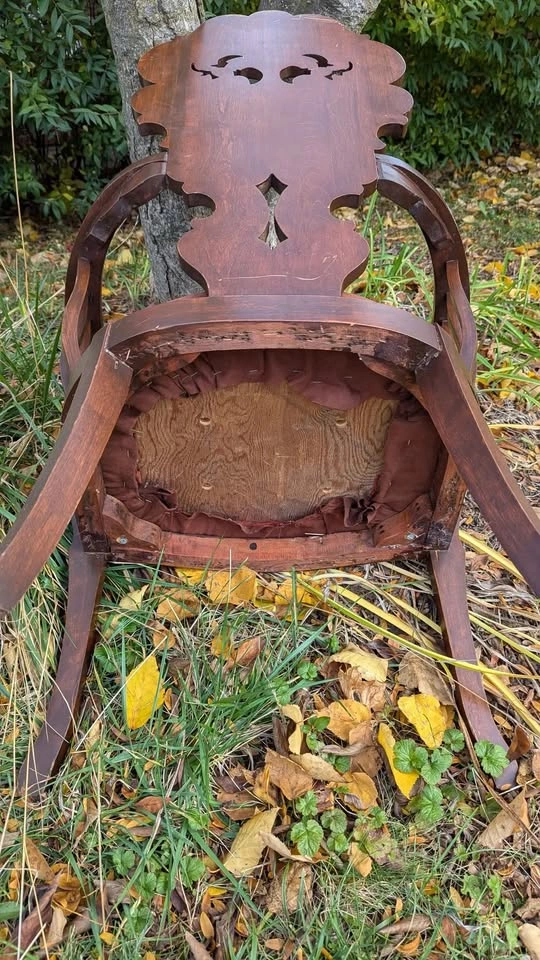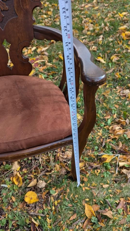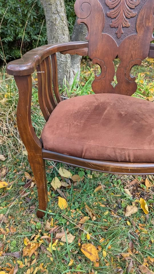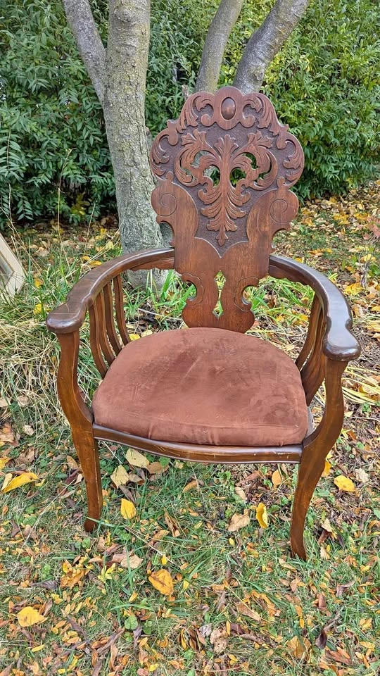 170Gorgeous vintage accent chair featuring an intricately carved wood backrest, curved arms, and a plush brown microsuede seat. Solid hardwood frame in a warm mahogany finish, beautifully detailed with ornate scrollwork and traditional craftsmanship. Height: 39” Width: 24” Seat height: 18” Mid-century reproduction of a Victorian design (1960s–70s) Solid wood (likely walnut or birch with mahogany stain) Clean seat, light surface wear on wood consistent with age Sturdy and comfortable, perfect for bedroom, entryway, or reading nook! Check my other listings for similar items! Pick up Burlington 📍 Porch pickup available payment only etransfer to hold, or same day pickup Cash, etransfer.