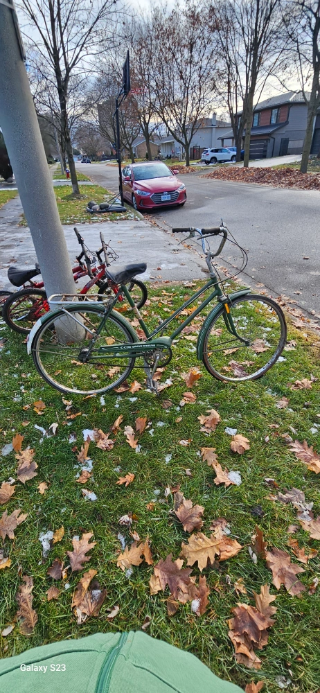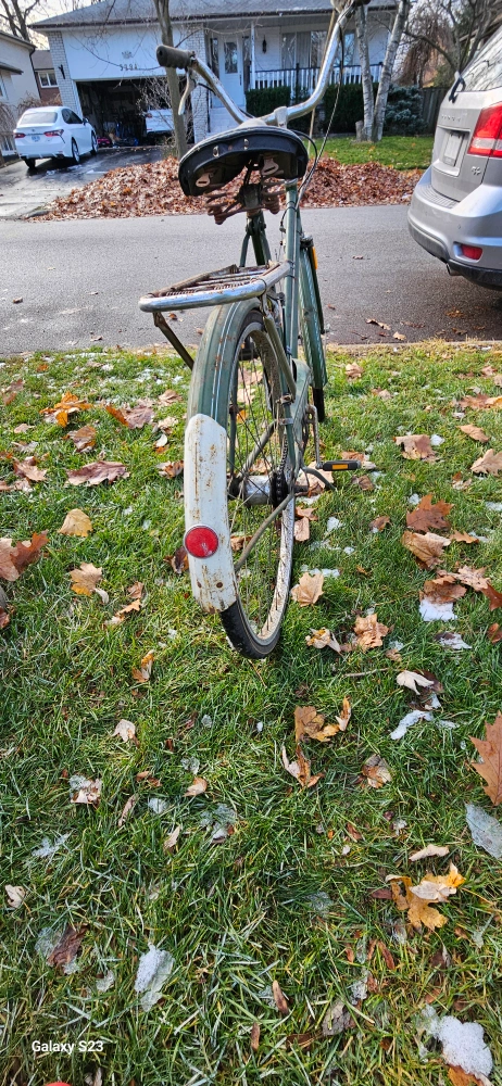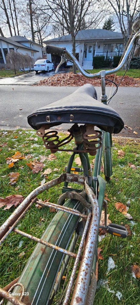 Green vintage bike with a rear rack and a spring saddle. Requires some need to be repaired