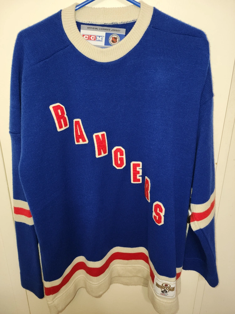 133Used, but in good shape. Vintage New York Rangers hockey jersey/sweater. Made in Canada. Size XL.
